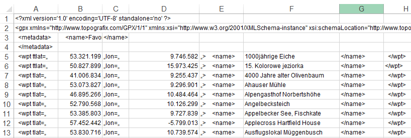 Ich habe mal versucht, die Lesezeichen-Datei aus K1 etwas aufzuteilen, sodass sie K3 auch importieren kann (und nicht nur als Overlay). Dazu habe ich die gpx-Datei mit Word geöffnet, mit der Ersetzen-Funktion die 3-Zeiler jedes Wegepunktes in eine Zeile gebracht und die einzelnen Elemente mit Tabs versehen, sodass ich die Tabelle mit Excel bearbeiten kann