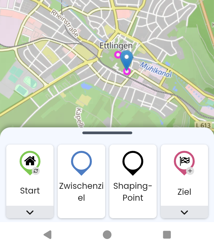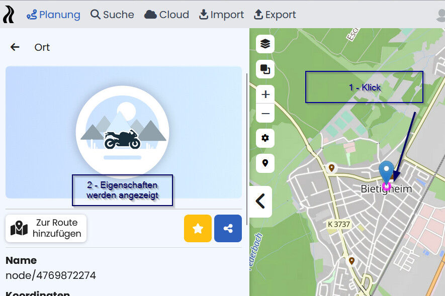 In beiden Fällen solltest Du auf ein Favoritensymbol oder einen Kreis auswählen können und den Punkt in die Route aufnehmen können. Bitte teste das nochmal.
