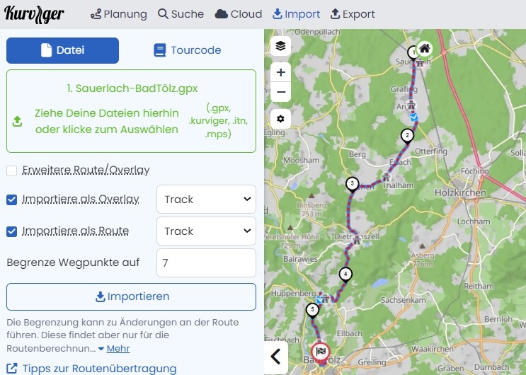 Hier nun eine beliebige .gpx-Datei: Sauerlach-BadTölz.gpx (61,4 KB) importiert in kurviger.de (wird in der App genauso sein) mit der richtigen Anzahl an Wegpunkten (alle ~5 km) ergibt die exakte Route: