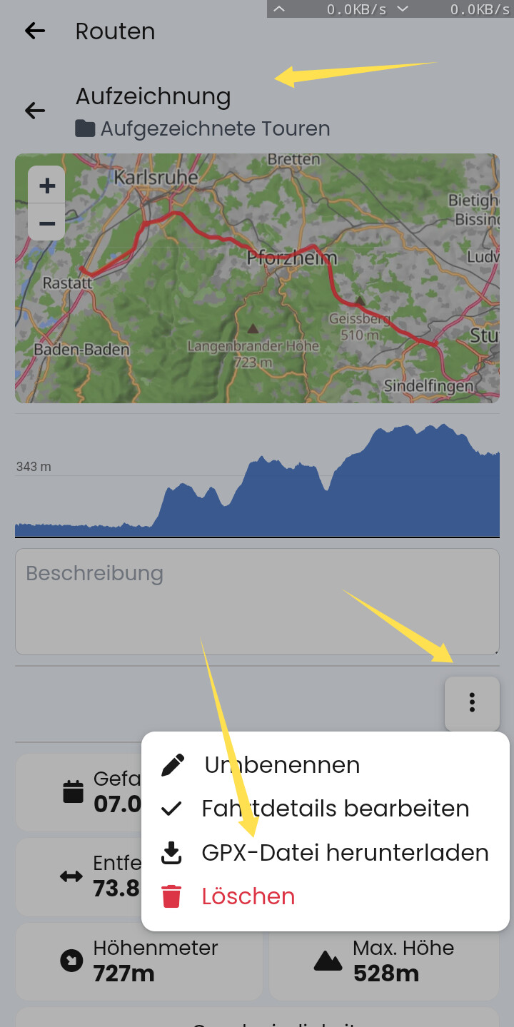 Wenn die aufgezeichnete Route geladen ist, ist ein Nachbearbeiten möglich. Das aber nur am Rande