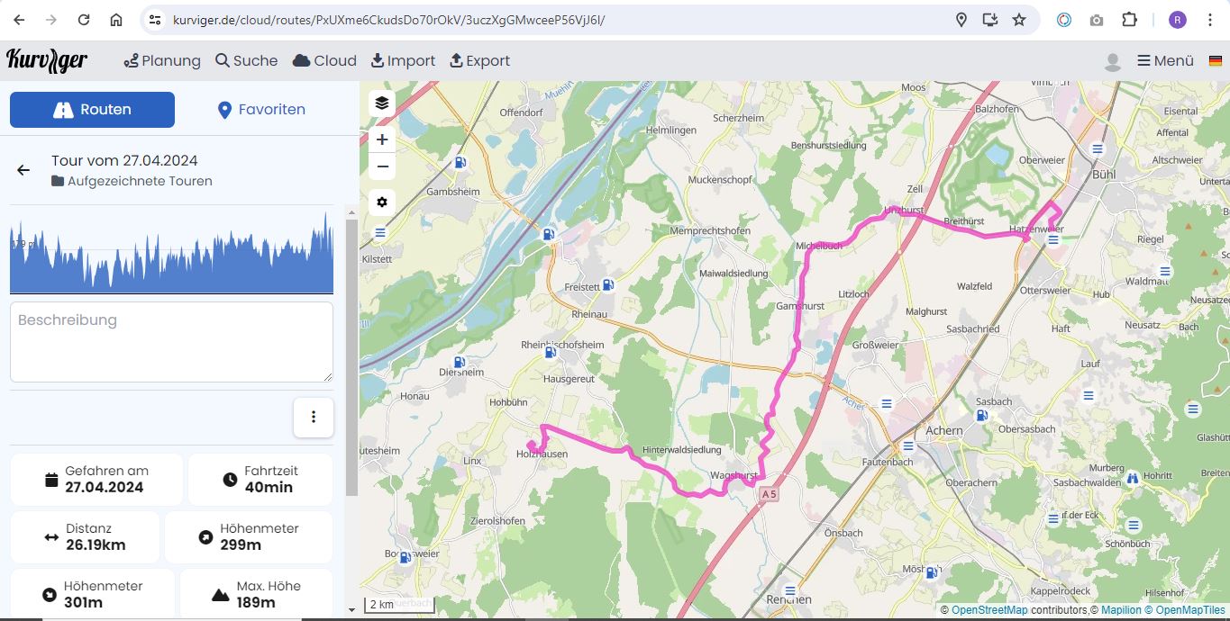 zu Testzwecken bin ich heute eine ca 27 km lange strecke im “Folgen-Modus” gefahren und habe die Aufzeichnung gespeichert.