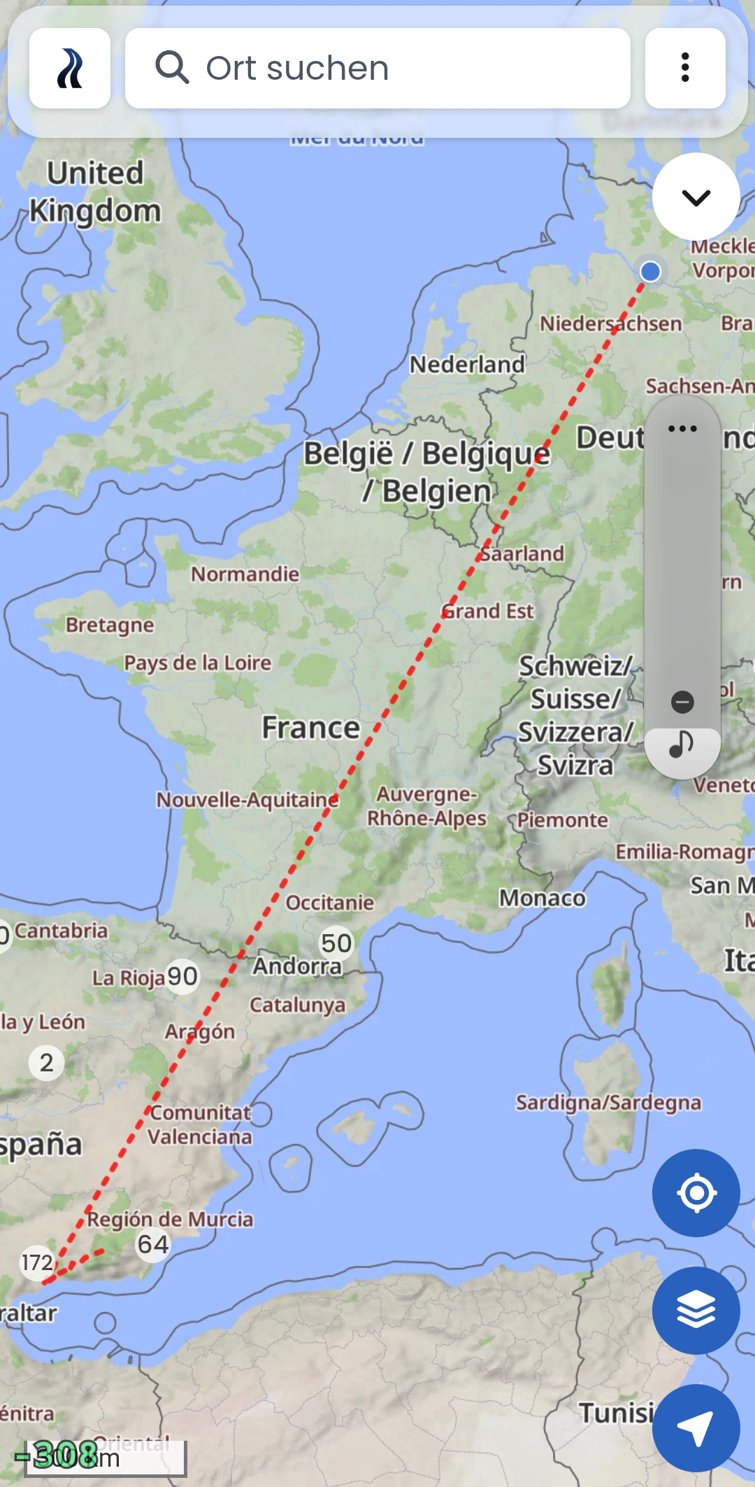 Der erste Punkt ist kilometerentfernt von dem eigentlichen Start (der 2. Punkt)