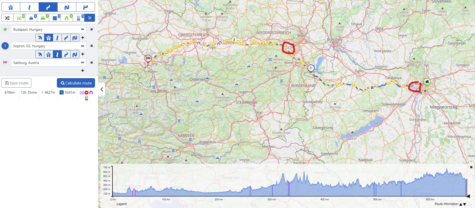 For example a simple route: Start: Budapest, Hungary - 1st Via pont: Sopron, Hungary - End: Salzburg, Austria.