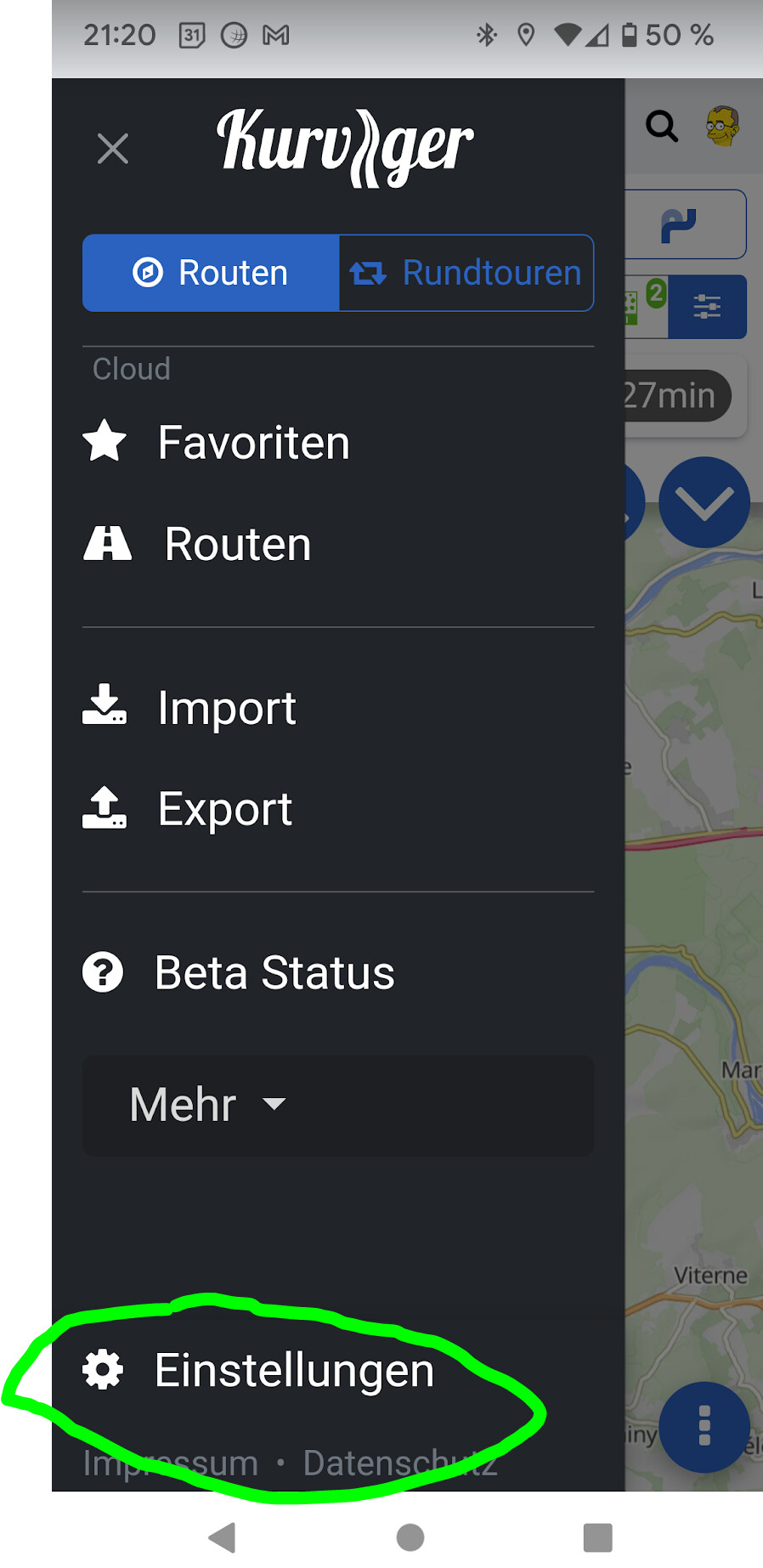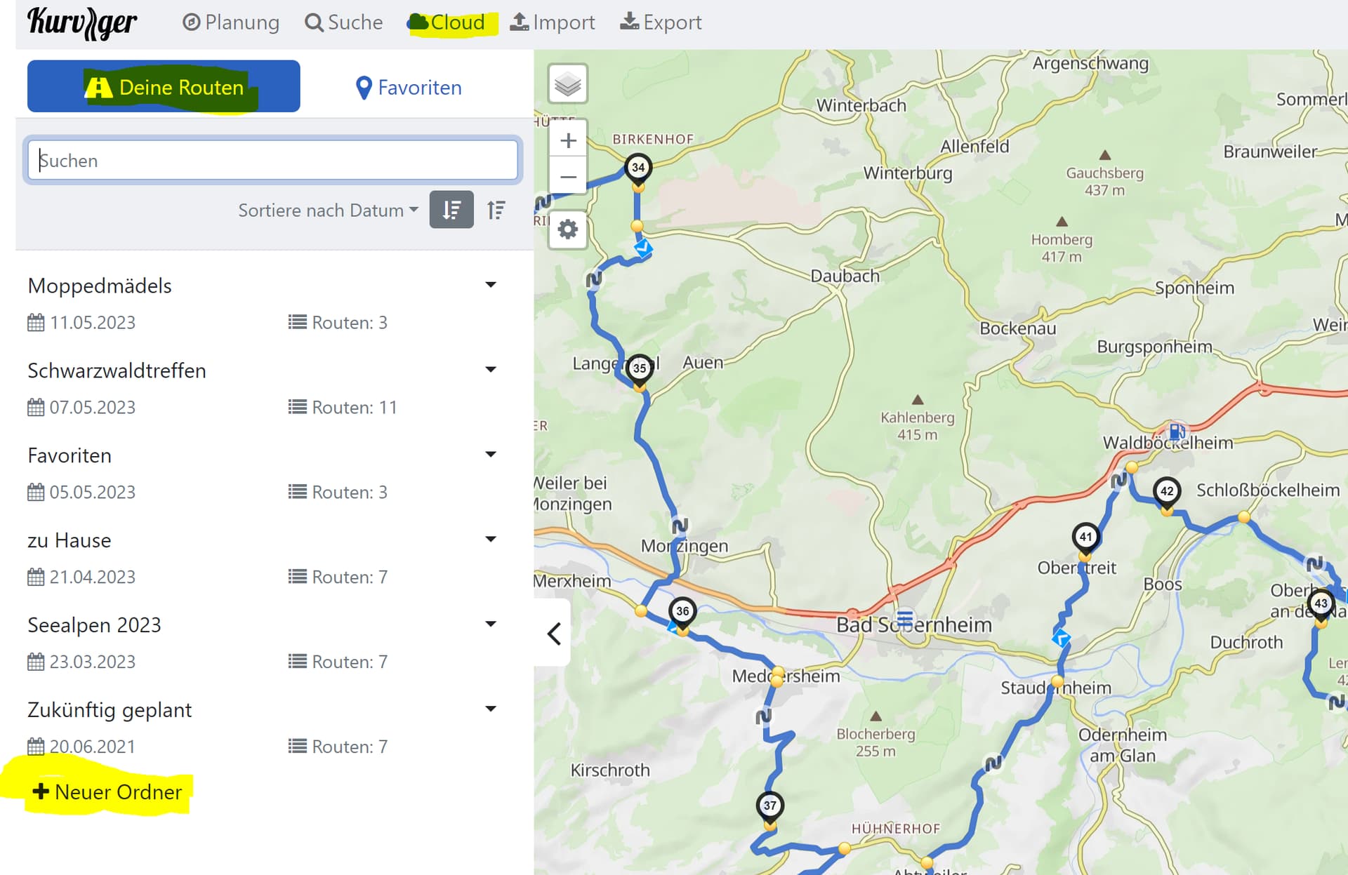 Tu peux soit les placer dans un nouveau dossier, soit les enregistrer dans les favoris. Tu peux ainsi recharger l’itinéraire planifié en cours de route, si tu as accès à Internet. Si ce n’est pas le cas, exporte l’itinéraire planifié en tant que fichier *.kurviger et enregistre-le dans un dossier local sur ton téléphone portable.