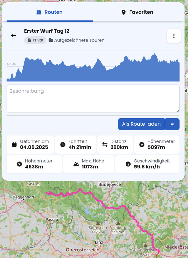 Lade ich die Aufzeichung als Route, so kommt dabei heraus: 367 km / 8h 28min, also kalkuliert 2 Stunden mehr, und in der obigen Tour sind Pausen enthalten und wir waren zu zweit.