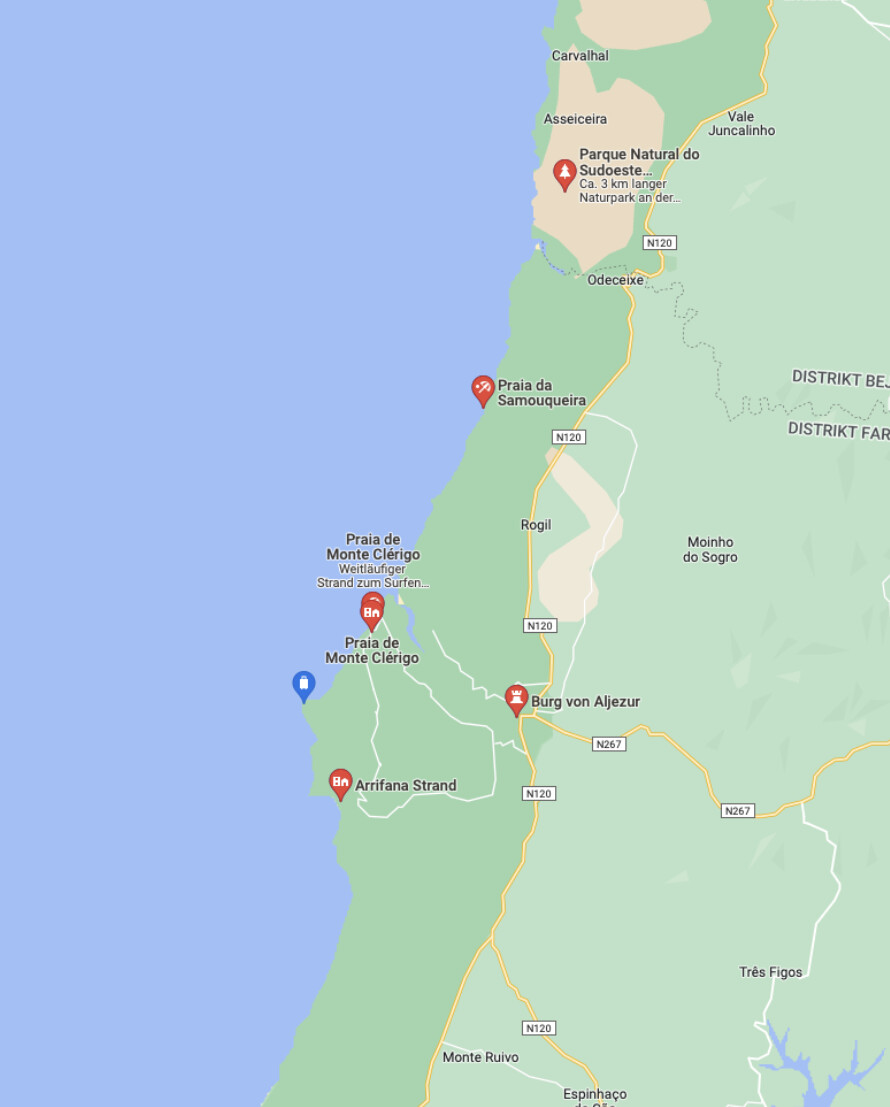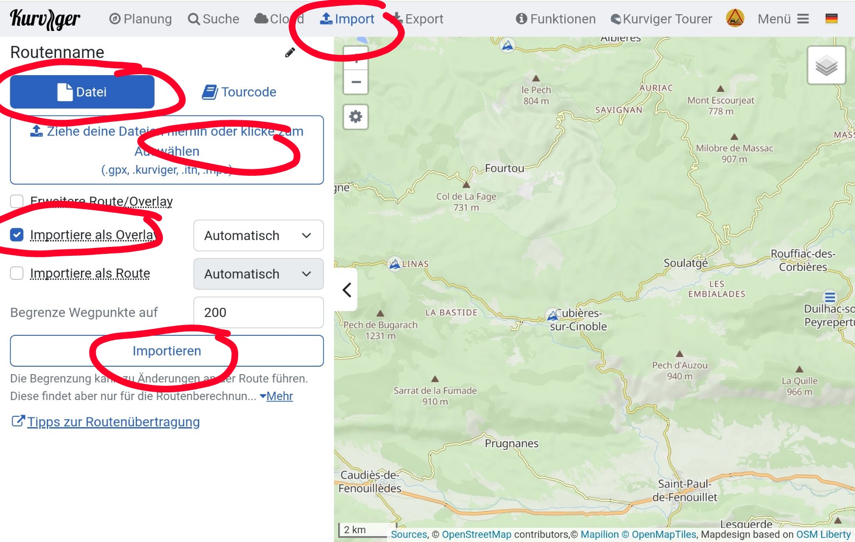 So far so good. In addition to the route, I have a list of POIs found in D&K, Baedeker, Google, Camper Guide, personal recommendations. For all these POIs, I add them to Kurviger.