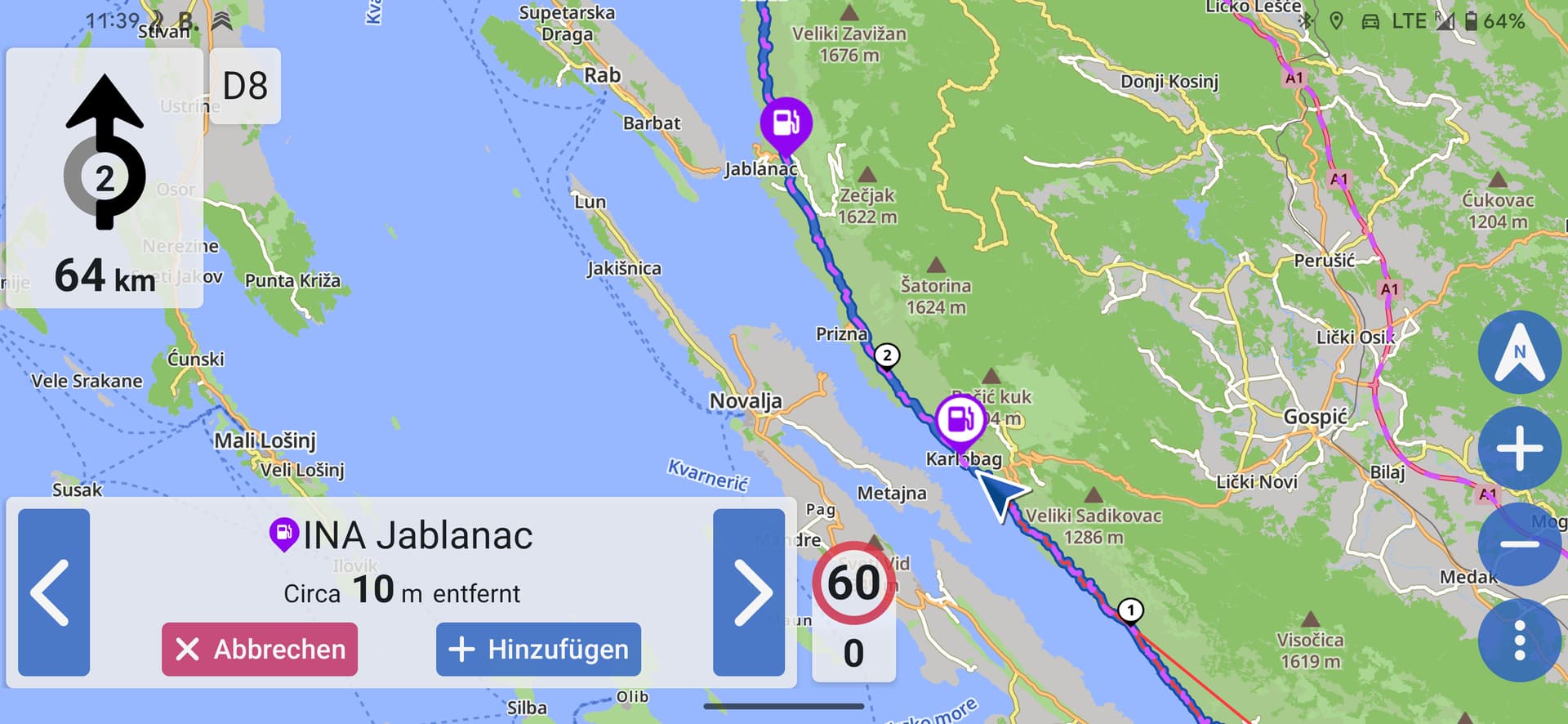 Während der Navigation auf Tankstellen Button geklickt und es waren nur 2 in der Nähe, Entfernung zu den beiden war “10m”, was natürlich um einige Kilometer falsch war. Hier die Screenshots: