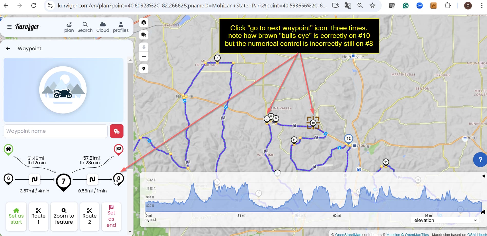 In EDGE the brown bulls eye correctly advanced to “9” on the map and the control being clicked correctly advanced from 8 as to become 10.