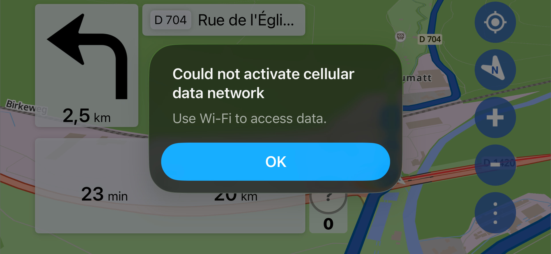 @boldtrn this could be an iOS system message triggered by kurviger via the notification framework. In the sense: Kurviger requires network connection, which is known to iOS and iOS will trigger that message if cellular data is unavailable. Debugging that will be horrible. From the layout and colouring of the message, it is rather a system message. This could be given as a bug report to apple. But to do that I will need to provide a screenshot. And currently, the weather conditions are not met to get to a new attempt.