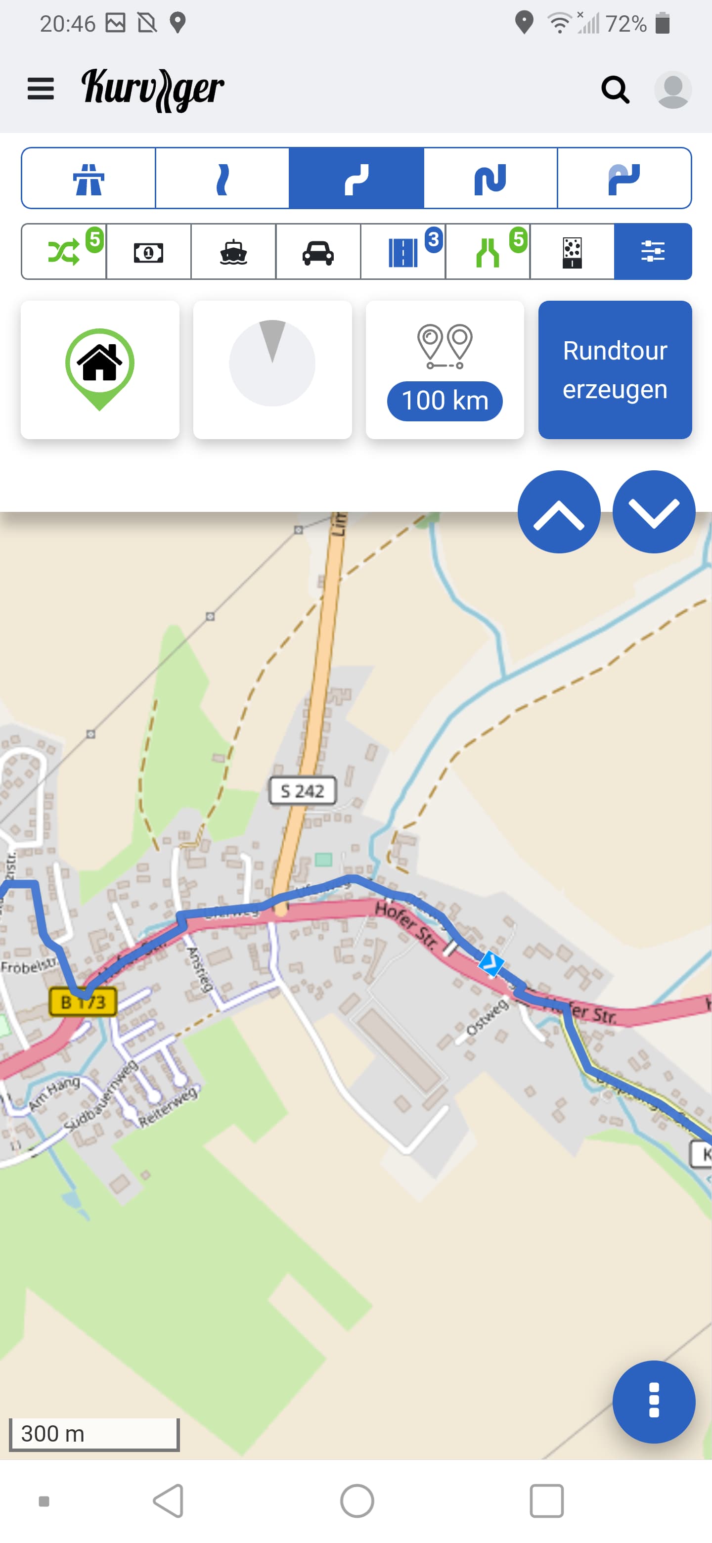 Voreinstellungen sind auf Kurvig mittel, kleinste Straßen vermeiden auf 5- bitte möglichst komplett vermeiden. Trotzdem plant die Software einen Umweg um 2 90Grad Kurven und schickt Dich in eine Zone 30 Anwohnerstraße um dort eine Kehre im verkehrsberuhigten Bereich einzulegen. Des Öfteren wird man von der Hauptstraße in eine parallel verlaufende Nebenstraße geleitet um 100m später auf die Hauptstraße zurück geführt zu werden.