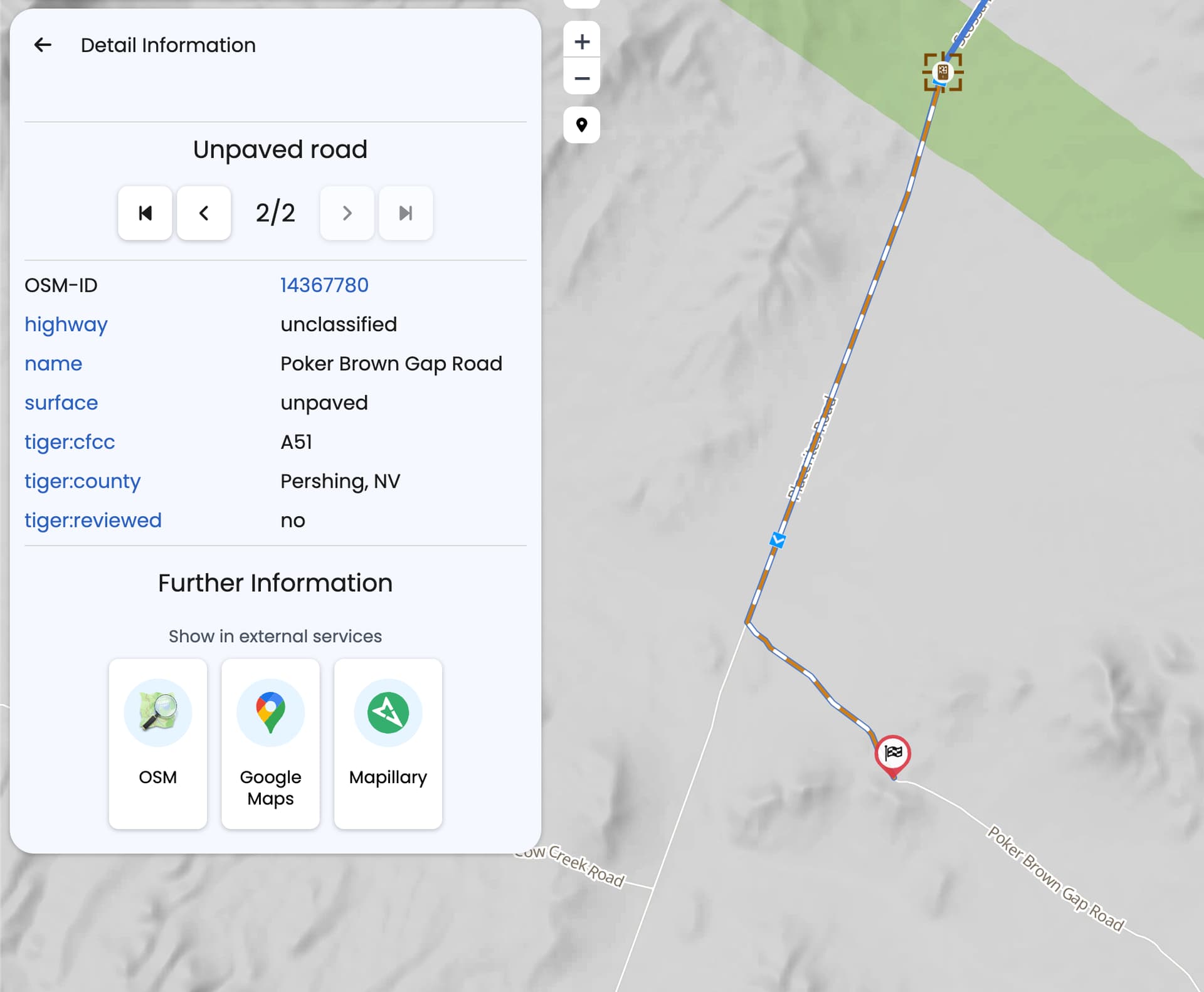 the intent of this request is to add additional tools to check if a road segment is gravel. Typically I use “google” to see if the point of interest has a “google street view” if it does then one can pull up the images to view the road conditions at time time the photo was taken. When a road does not have a “street view” then I use google satalite and zoom in as tight as I can, quite often one can see the “painted” lines on road which is proof it is paved. Sometimes like in the example above the road IS paved but it is not PAINTED (in this example the road does have a street view).