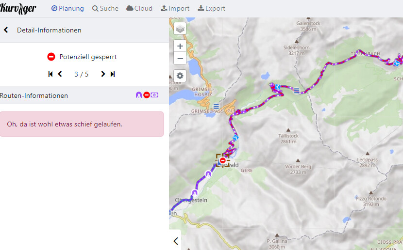 Furkapass wurde erst angezeigt und dann “…ist etwas schief gelaufen.”