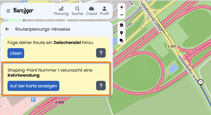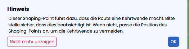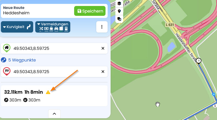 Du siehst in Deiner Planung dieses gelbe Warndreick. Kurviger hat hier etwas festegestellt mit der Bitte, dass Du das prüfst, also ob Absicht oder eben unbeabsichtigt.