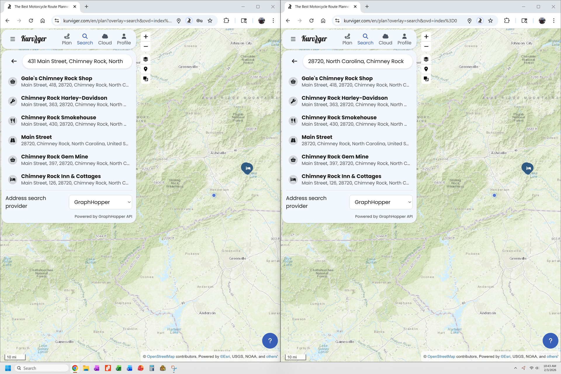 From the perspective of a long-time US user, the Kurviger weakness that it does not find addresses as easily as Google Maps is seriously limiting Kurviger’s growth. When I introduce Kurviger to someone, I have to show them how to work around this weakness. This is usually enough to stop them from adopting Kurviger. Example (see screen shot below): When I enter “431 Main Street, Chimney Rock, North Carolina, 28720” (letter style order), Kurviger offers me the street (Main Street) and five different businesses on that street, but it fails to find 431 which is the address for the building at the entrance to Chimney Rock State Park. If I enter the address in reverse order (28720, North Carolina, Chimney Rock, Main Street, 431), I get the same result.