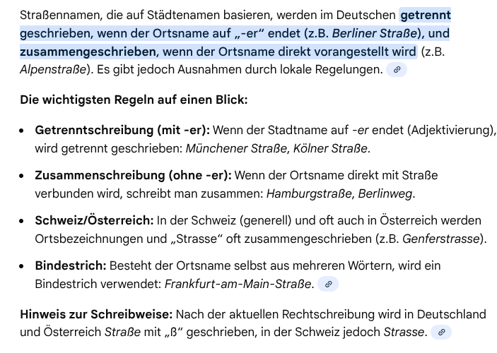 Das stimmt ja so nicht. Dort lernt man, das man die StraĂźe nicht mit dem StraĂźennamen zusammen schreiben darf. Also nicht, wie im allgemeinen Sprachgebrauch ĂĽblich KoblenzerstraĂźe, sondern Koblenzer StraĂźe.