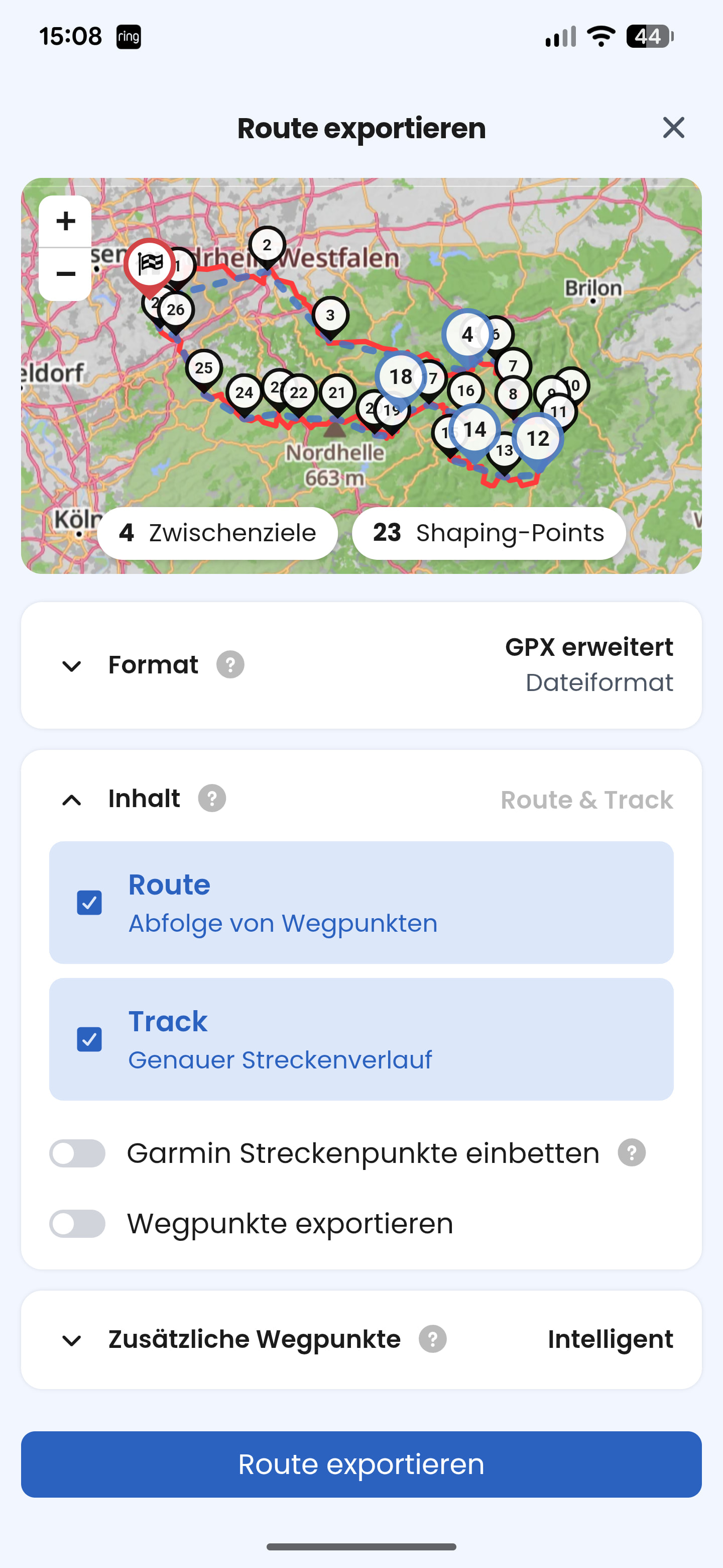 Exportiere ich die Planung als GPX, mit Route und Track, intelligente Zusatzpunkte, kommt leider bei der Route so etwas dabei raus. Übersehe ich eine einfach Möglichkeit aus der Kurviger Planung eine vernünftige GPX Route zu erstellen?