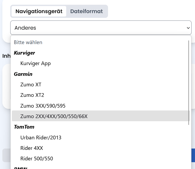 Einfache Variante: Export nur als Track, ist nie falsch, Routenberechnung gibt es nicht d.h. schnell in der Handhabung aber dann am Motorrad doch schwierig von der Ablesbarkeit weil AutoZoom manchmal auch nicht gut funktioniert.