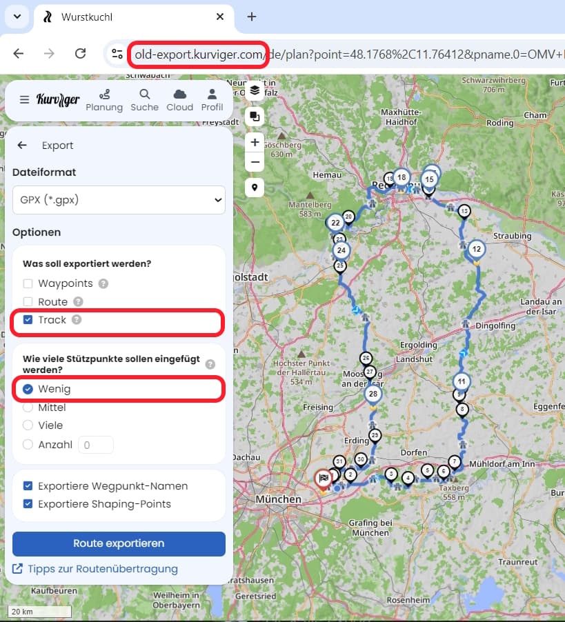 Hier die beiden .gpx-Files und das .kurviger-File: Wurstkuchl_new.gpx (488,8 KB) Wurstkuchl_old.gpx (530,3 KB) Wurstkuchl.kurviger (60,5 KB)