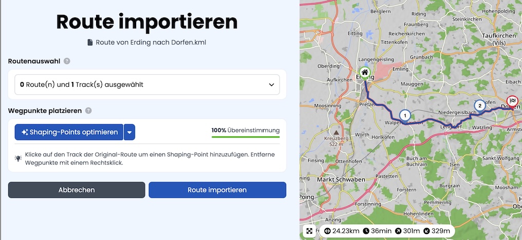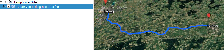 Beim kml Import mit Auswahl nur Track wird die Route 1:1 angezeigt.