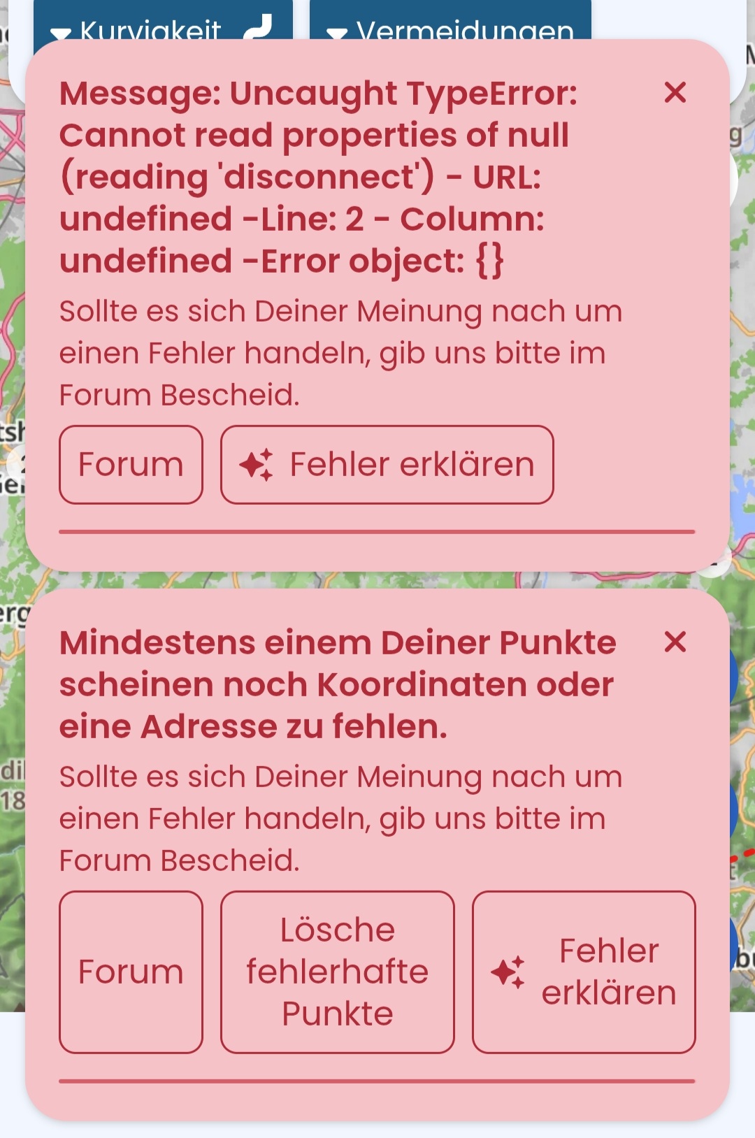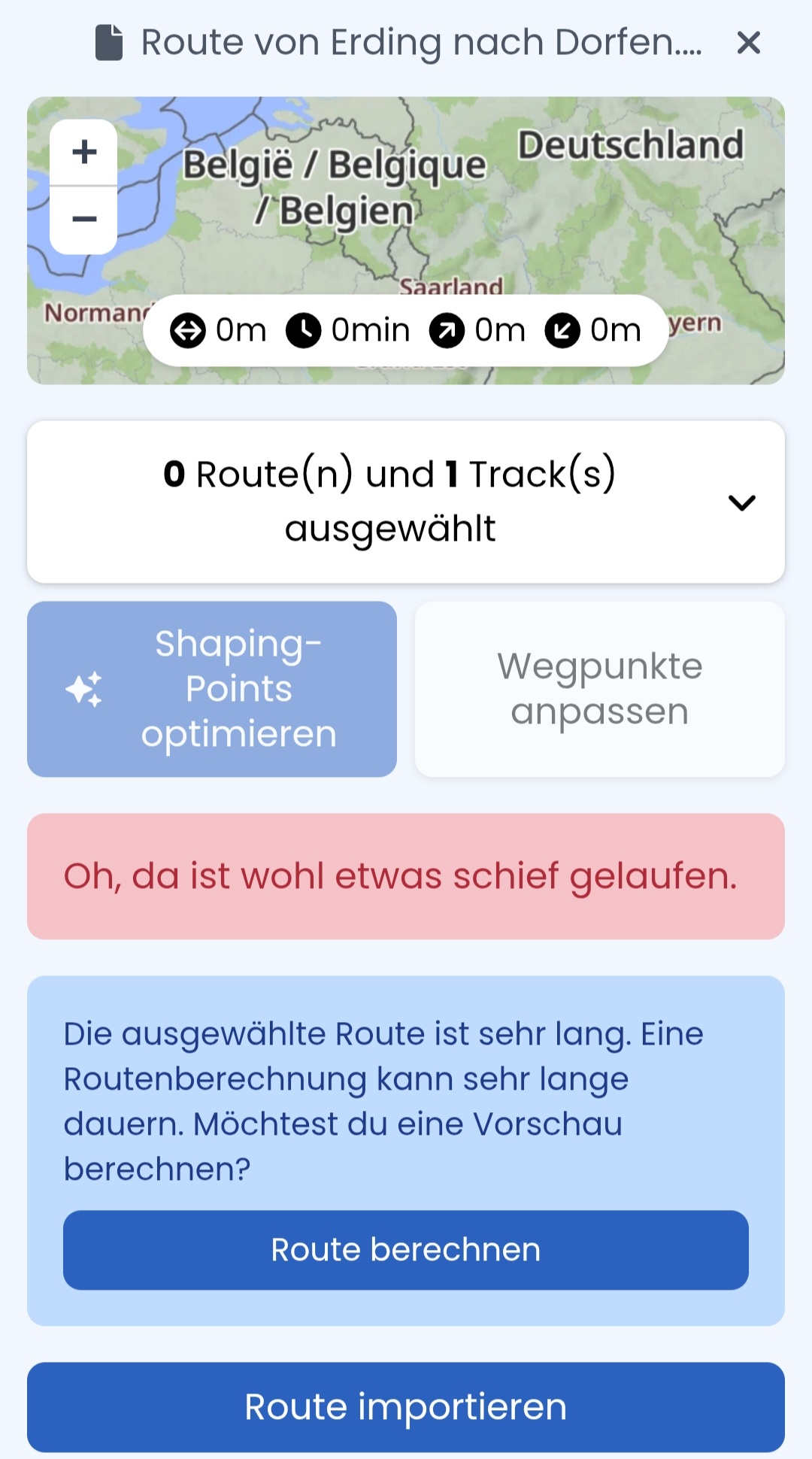 Nun habe ich einen Freund, der seine Oldtimer-Touren mit G-Maps plant und mir vor einiger Zeit mal ein .kml File geschickt hat. Das ließ sich genauso wenig in Kurviger importieren wie die kurze Route, die ich daraufhin in G-Maps selbst erstellt habe.