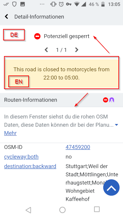 in the details of a potentially cloesed route, the OSM hint is displayed in EN, though user language is DE.