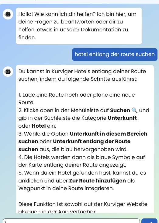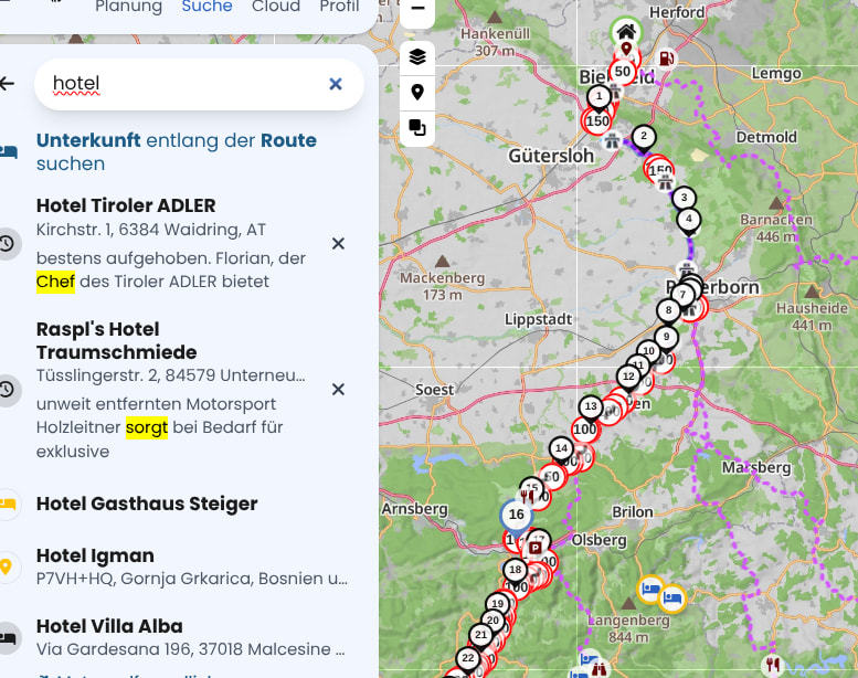 Ausserdem kannst du, wenn eine Route angezeigt wird über die Suche gehen. Ins Suchfeld “Hotel” eingeben , dann “Entlang der Route” antippen und dann siehst du eine Menge Hotels an deiner Route.