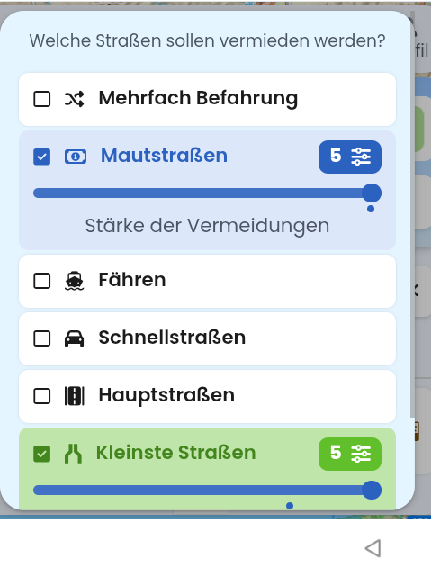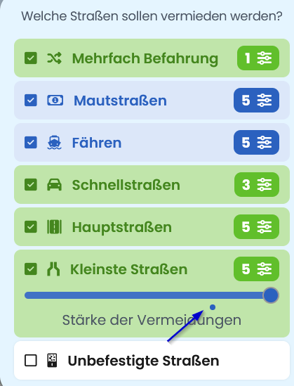 Wenn beim grünen Balken die Einstellung von 5 auf den Punkt (hier bei 4) verschiebst, ist der Balken wieder weiß. Also geh ich davon aus, dass da eine Kleinste Straße gefahren wird. So meine Interpretation.