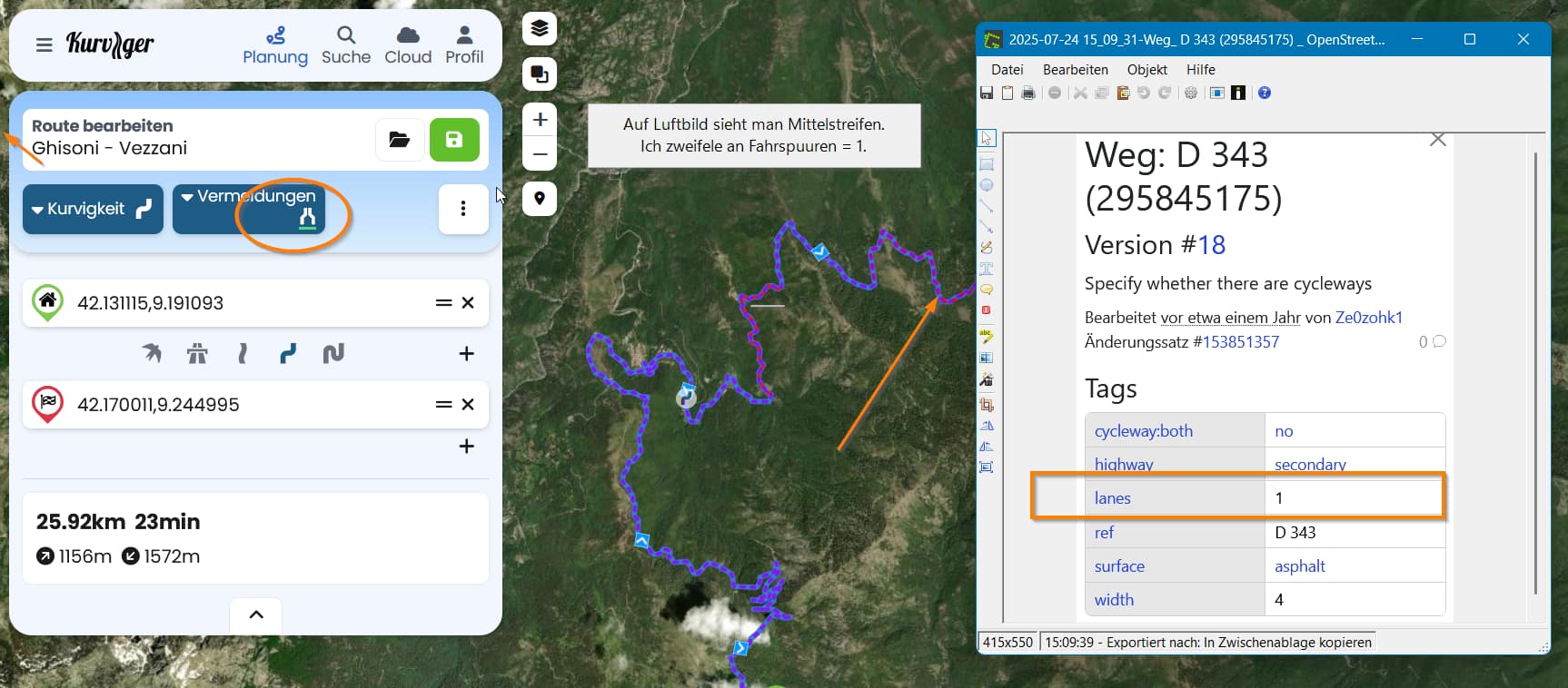 Wenn die Datenlage so dünn oder sogar falsch ist, verstehe ich dass Kurviger das lanes=* Tag nicht berücksichtigt.