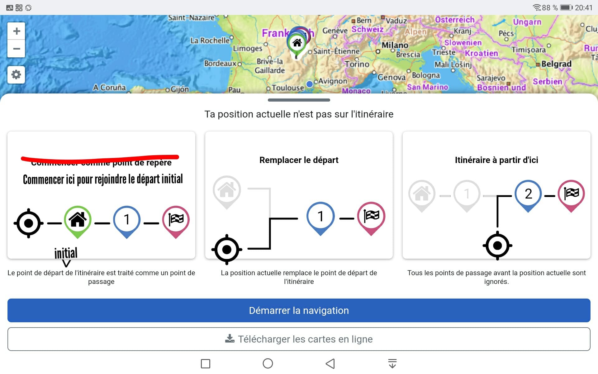 Bonjour, vous avez amélioré le choix pour démarrer un itinéraire lorsque que l’on est pas sur le point de départ avec 3 dessins explicites et clairs, Bravo !