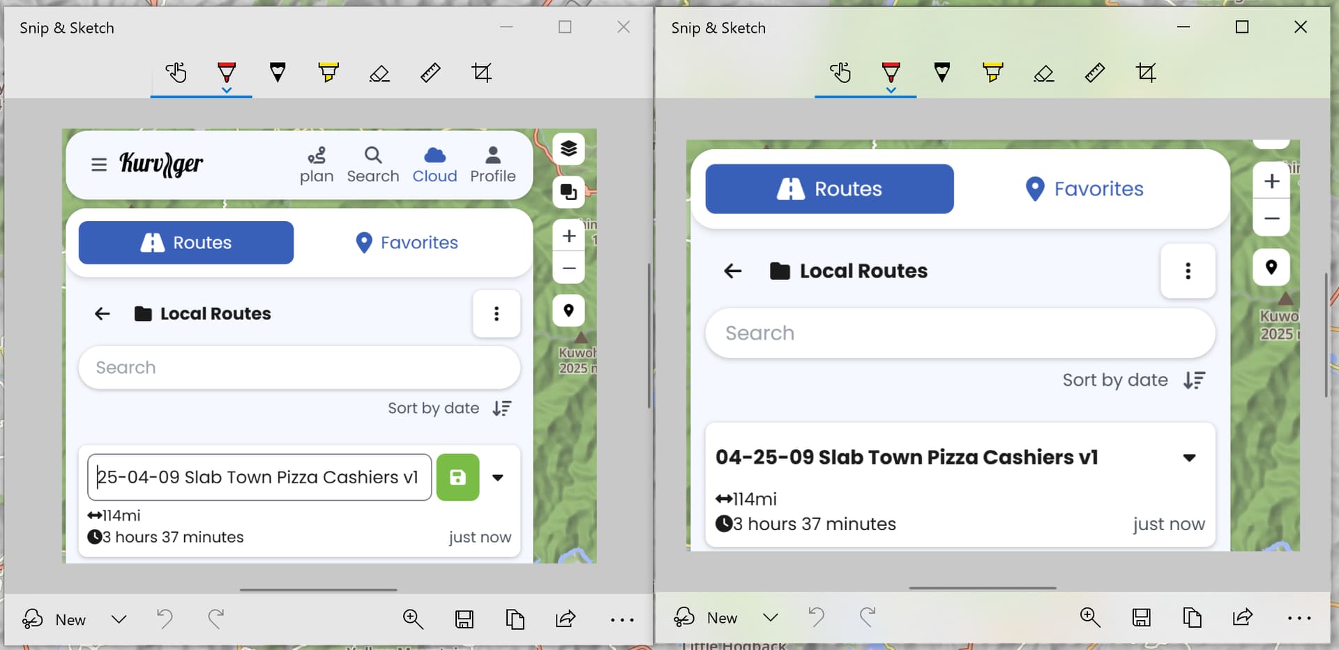 When I rename my route in the cloud using YY-MM-DD as the first 8 characters in an otherwise word name, Kurviger reorders the YY-MM-DD to be MM-YY-DD. Example: In the left picture below, I have entered the name I want. When I select Save, the right picture is the name presented to me by Kurviger Cloud.