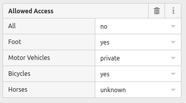 So, there’s a possible contradiction between all=no and bicycle yes. Unfortunately, I don’t know how to remove the all tag. Would all=yes be a safe choice given the value for motor_vehicle?