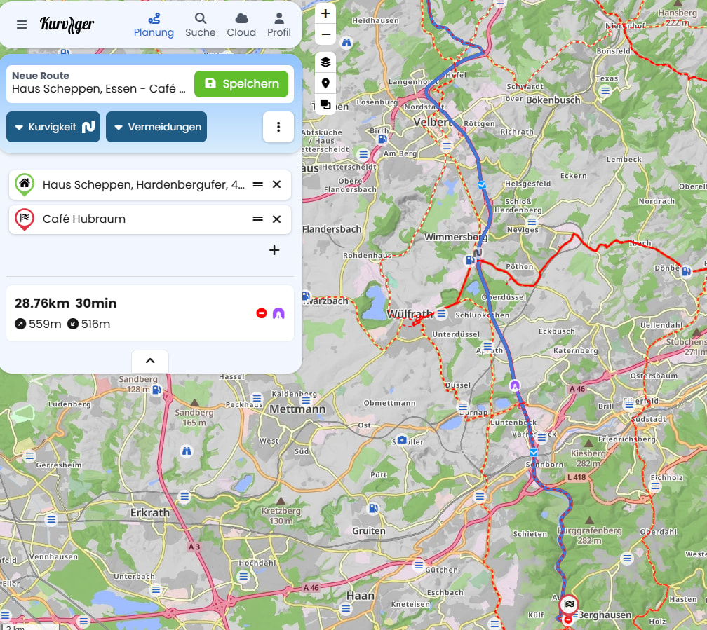 ich wollte heute “Extra kurvig” vom Haus Scheppen zum Cafe hubraum fahren. Die Kurvigkeit scheint defekt zu sein