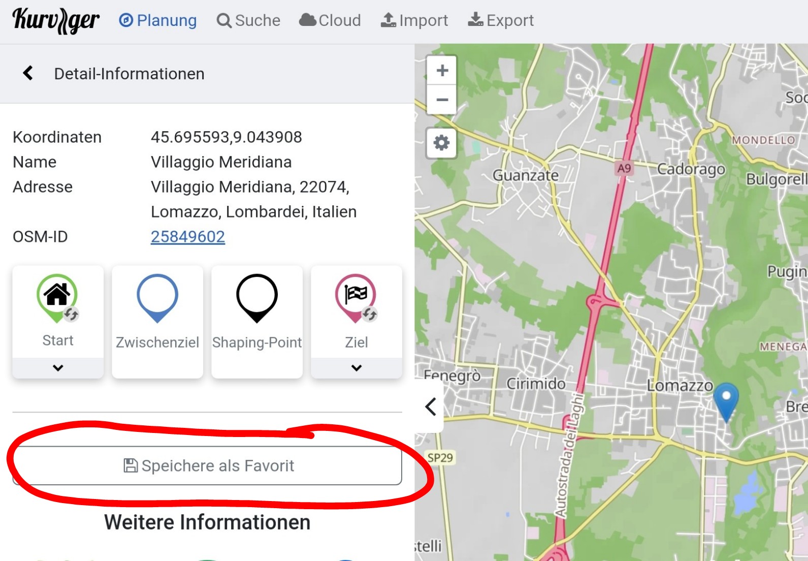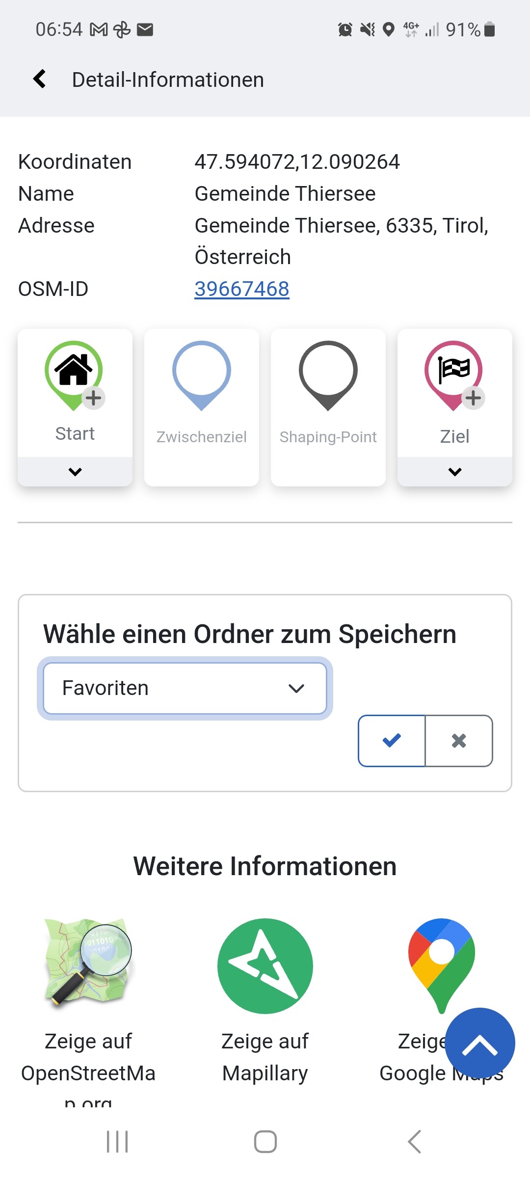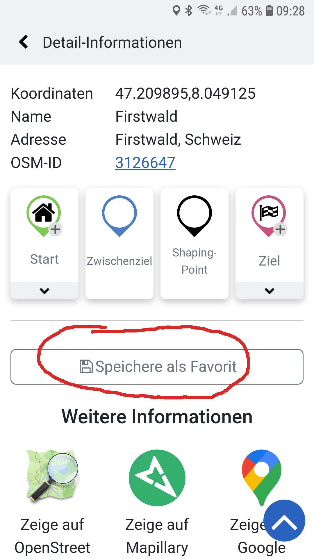 Wir haben da einige Punkte auf unsere Liste und wollen die UI weiter vereinfachen. Alle Optionen anzuzeigen ist aber auch keine gute Option, denn meistens willst du den Punkt ja in die Route integrieren und nur sehr selten als Favorit anlegen. Daher ist der Punkt etwas versteckt.