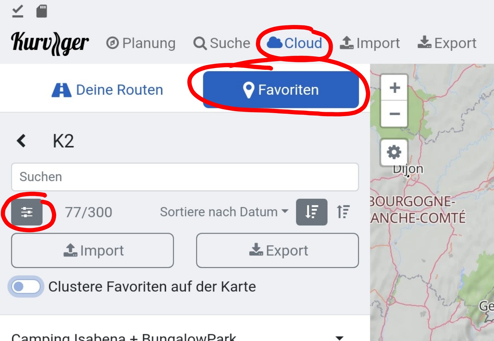These can be created in folders with 300 entries each and even imported. These are then available to all devices (web and app) via the Kurviger Cloud.
