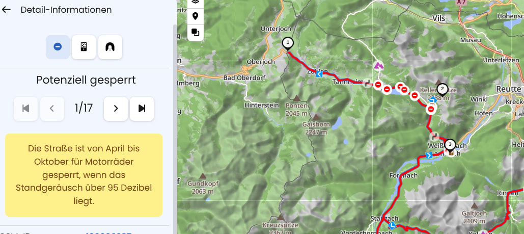 Hey. Genau das Probleme habe ich auch. Es sollte doch möglich sein, dass das Team von Kurviger ein Pässe Overlay “Over 95 DB” zu erstellt. In den Einstellung unter Informationen dann einfach “Over 95 DB” markieren und bei der Planung werden dann die gesperrten Pässe ausgenommen. Ich habe keine Idee, wie ich das machen könnte, also alle Pässe mit Sperrung über 95 DB (Tirol) markieren (z.B. als Route) und dann als Overlay abspeichern. Hm…denke ich hier falsch?