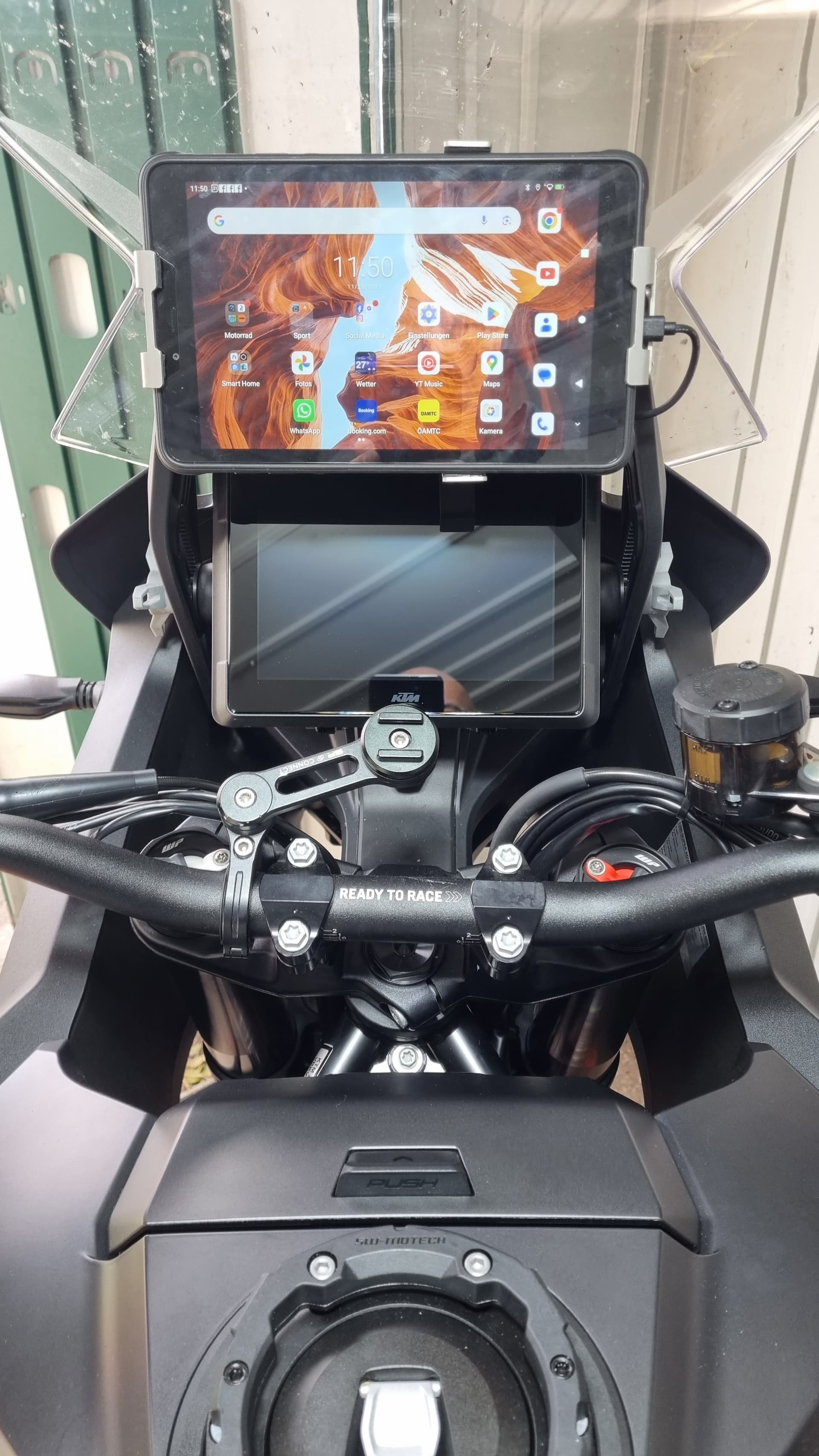 ich habe mich für ein 8 Zoll Ulefone Armor Pad (von Amazon) entschieden. Das Teil ist wasserfest, kann mit Handschuhen (halbwegs brauchbar) bedient werden und hat ein eingebautes GPS. Ich habe eine KTM 1290 Super Adventure S, welche seit Oktober letzten Jahres habe. Sie hat gerade mal 500 km drauf, mehr habe ich noch nicht geschafft. Auf der KTM habe ich eine sehr gute Navihalterung (von jemanden aus dem KTM Forum, der die baut) und auf dieser ist die Handy/Tablett-Halterung von holder4bikers.eu drauf. Die Stromversorgung habe ich direkt vom Motorrad über USB Adapter abgezweigt (am Zündungs-Plus).