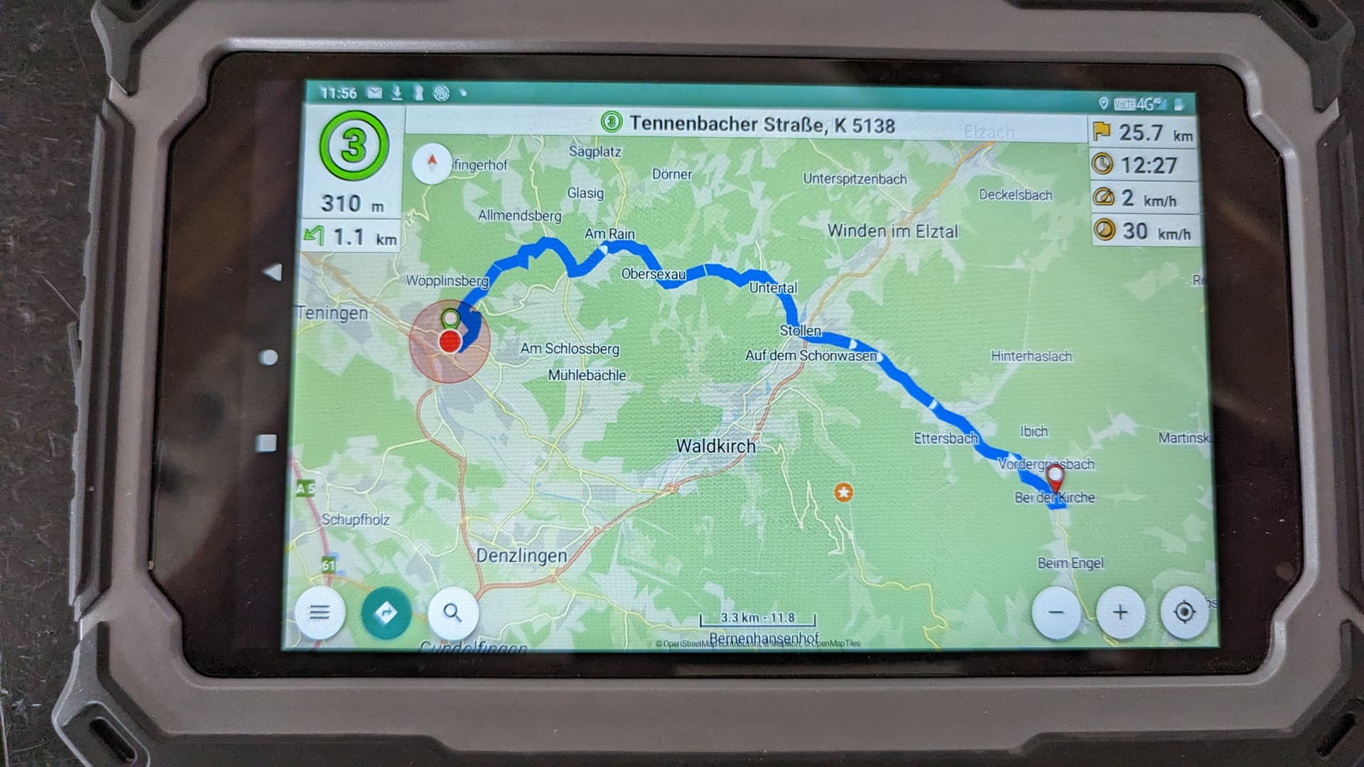 Ich importiere eine GPX Datei in Kurviger, sieht prima aus. Ich gebe die Datei an mein Android-Tablet weiter (Carpe Iter) , funktioniert. Jetzt möchte ich die Route auf abfahren und klicke auf den ‘Navigieren’ Knopf. Oben links und rechts erscheinen die Navigationsdaten, aber die Ansicht zeigt ‘nur’ die ganze Route, keine Detailansicht.