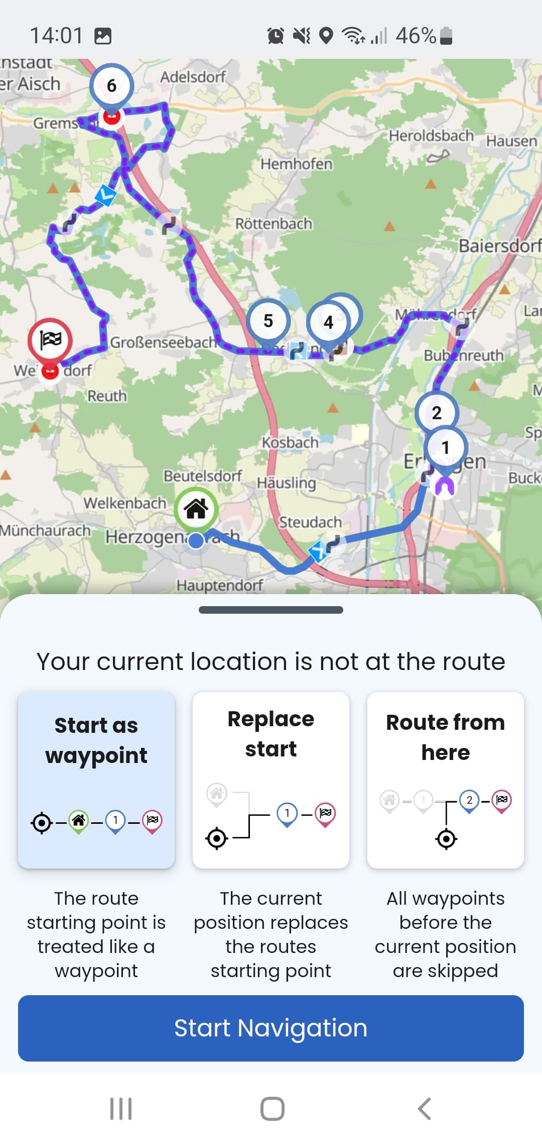 Genau, Start ersetzen ist der Standard bei quasi allen Navis. Du möchtest deine VPs besuchen und bist irgendwo. Du hast vielleicht von Zuhause aus geplant, fährst aber von deiner Arbeit direkt los, du willst aber trotzdem zu VP1 und nicht erst nach Hause. Das ist der Standard, dass auch nicht ausversehen VPs übersprungen werden. Wenn du Offroute bist, geht die Route von “Vorne” los.