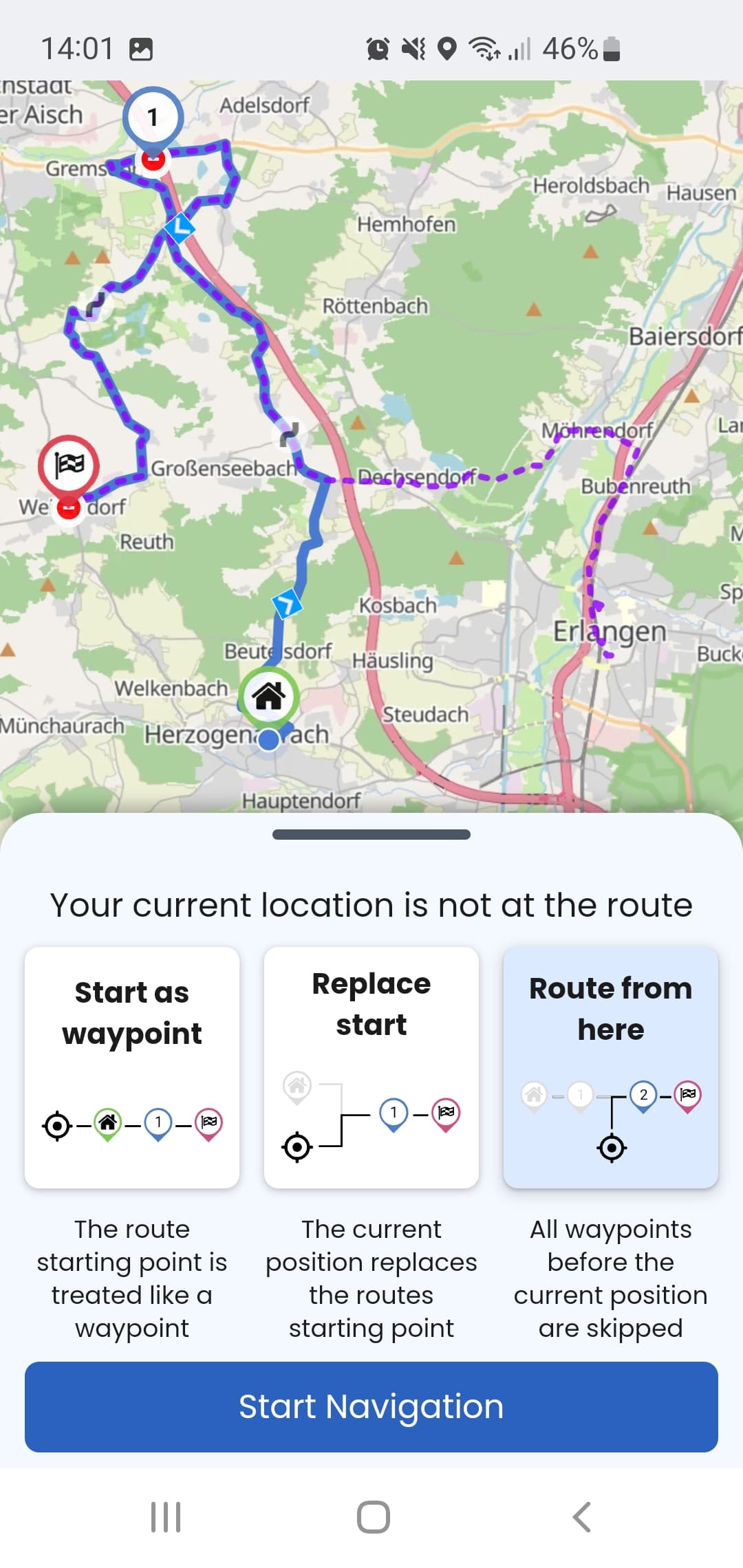 Gestern passierte es: Ich war abseits der Route, diese war geladen, die automatische Neuberechnung war ausgeschaltet. Ebenso die Navigation. Ich wollte nicht “auf optischen Weg”, also ohne Routenführung nur nach Karte weiterfahren, sodass ich die Navigation aktivierte.