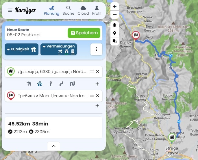 Weil die längere Route von den Straßenbelag schlechter ist und sicher viel weniger benutzt wird, sind dort keine Geschwindigkeitsbegrenzungen eingetragen und so kommt Kurviger wahrscheinlich auf eine kürzere Fahrzeit, als bei der kürzeren Route. Was macht dann Kurviger “falsch”? Meiner Meinung nach nimmt Kurviger zu optimistische Werte bei fehlenden Angaben an.