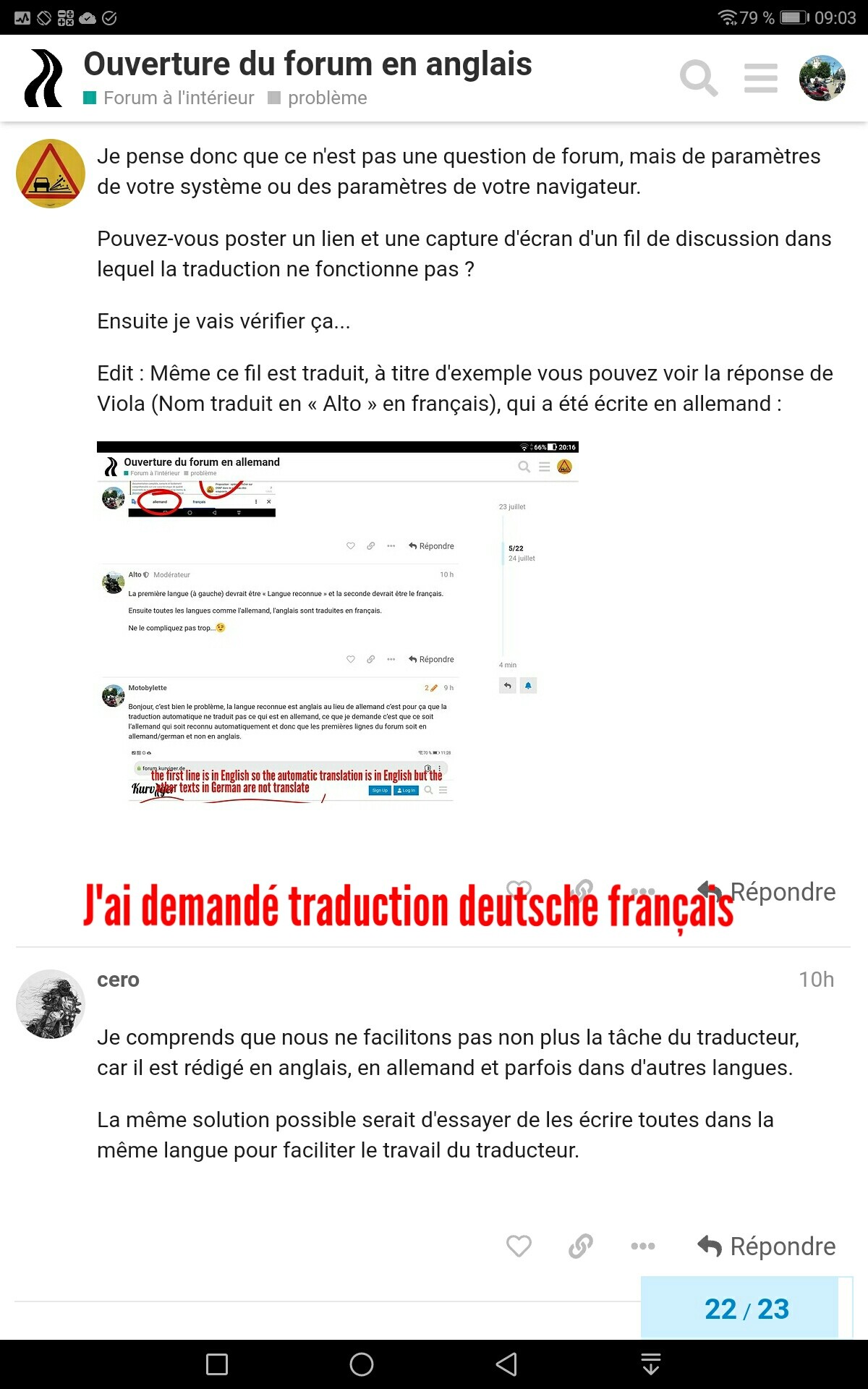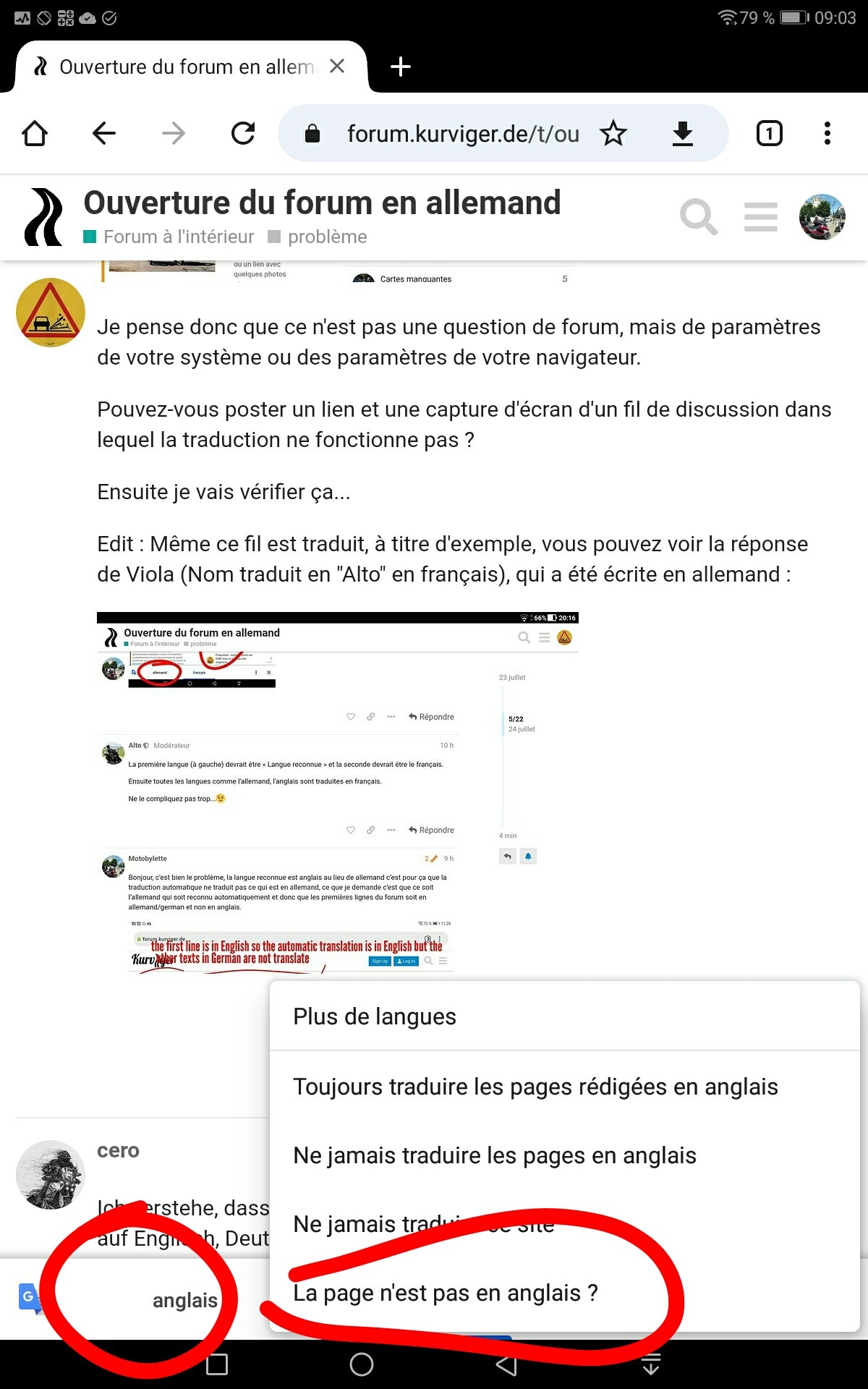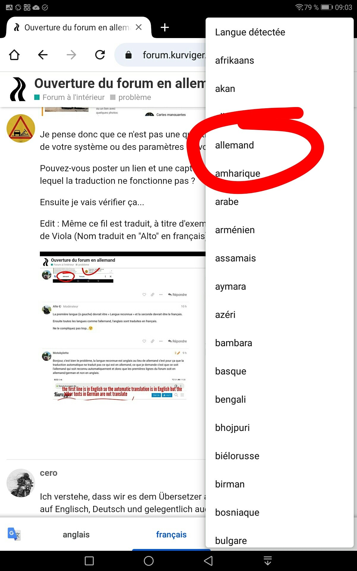 Donc le problème c’est qu’il ya plusieurs langues et que le traducteur en lisant le début du forum voit de l’anglais et traduit anglais-français mais pas l’allemand, si le début du forum est en deutsch il traduit deutsche-français soit 90% des textes du forum.