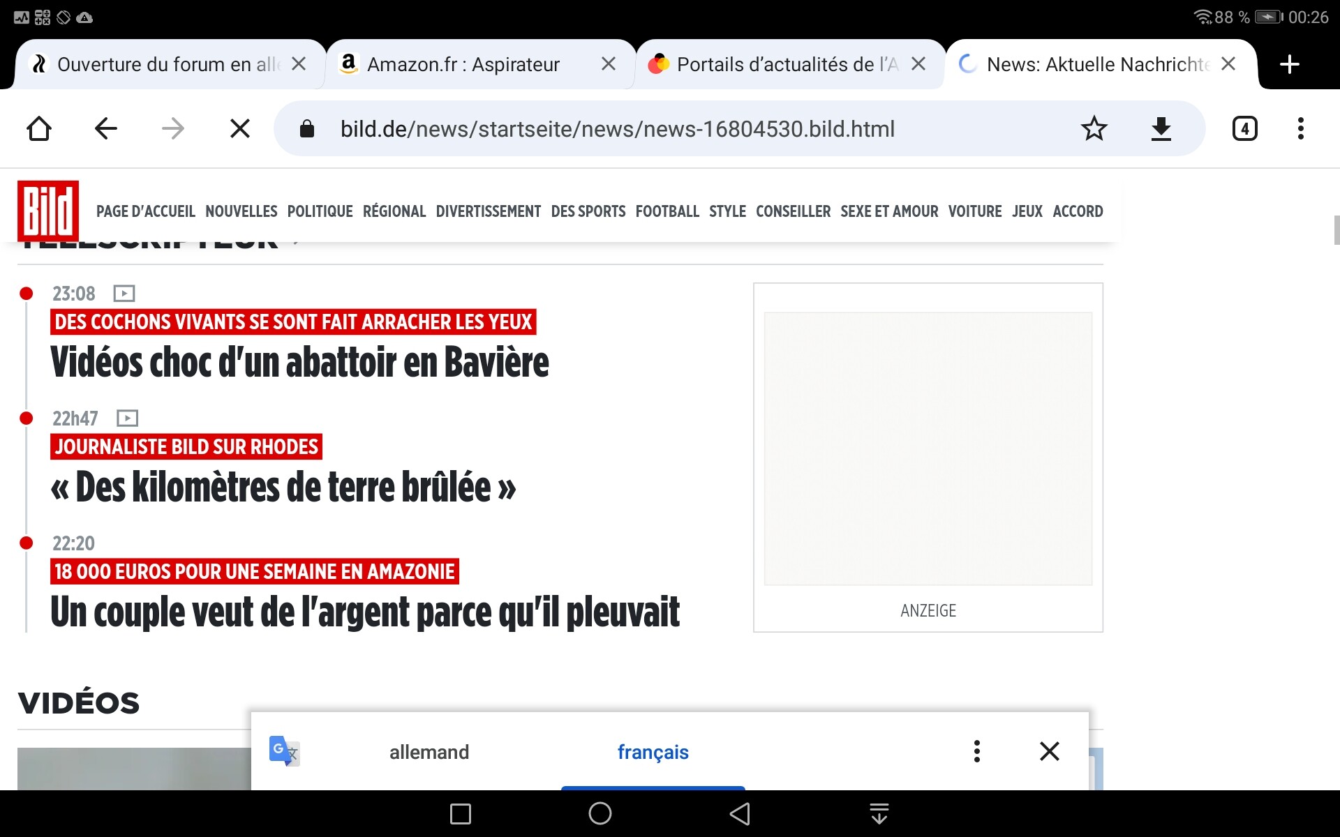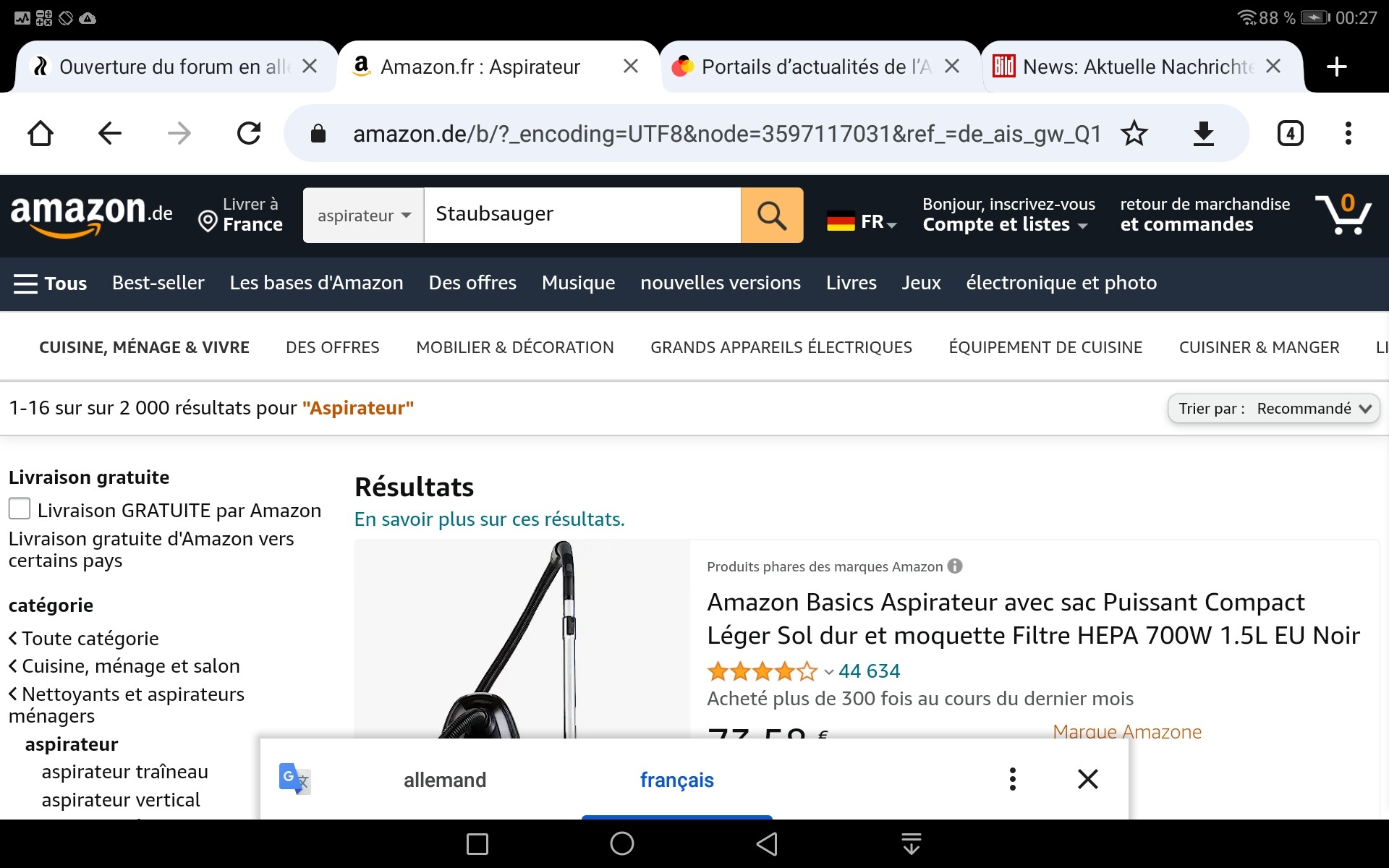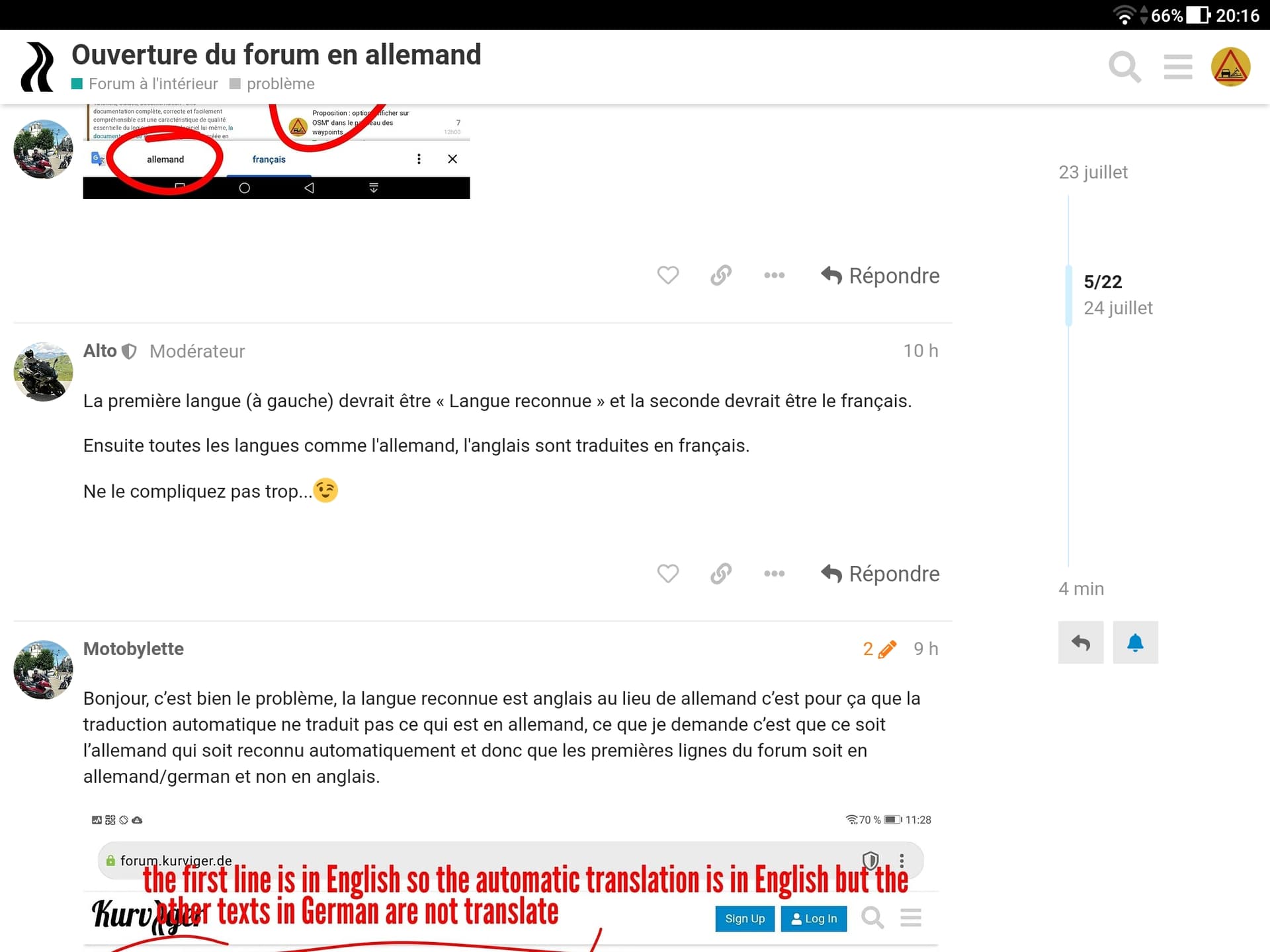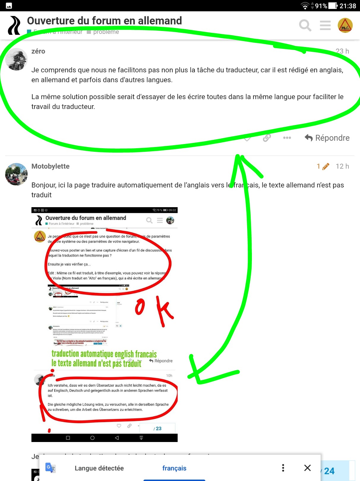 Donc le problème c’est qu’il ya plusieurs langues et que le traducteur en lisant le début du forum voit de l’anglais et traduit anglais-français mais pas l’allemand, si le début du forum est en deutsch il traduit deutsche-français soit 90% des textes du forum.