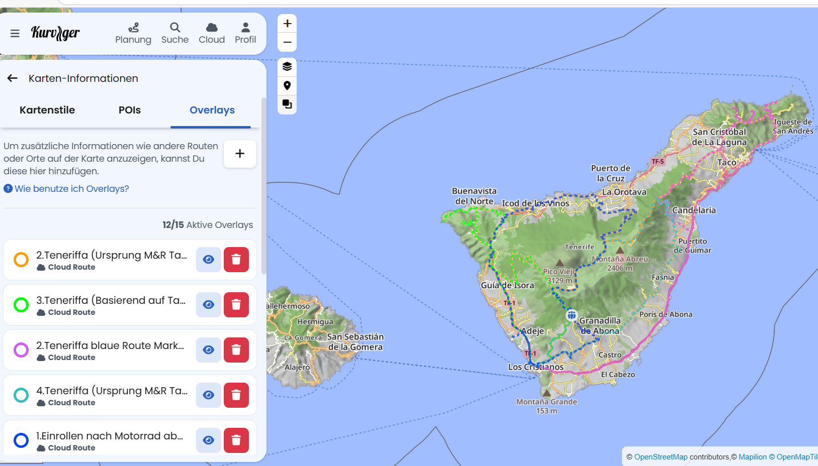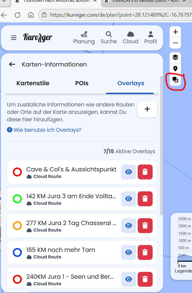 So ich habe mir jetzt gerade mal mein Laptop geholt zum ersten Cafe des Tages. Wenn man in der Planung steht und man hat eine Route/Ordner aus der Cloud geladen, rechts auf den kleinen Knopf Overlays drücken. Dort kann man jetzt Routen als Overlays hinzufügen und diese speichern. Das ist das, was du meinst? Wenn du erst den ganzen Ordner hinzufügst, kannst du anschließend auch einzelne Routen hinzufügen und diesen dann verschieden Farben geben. Wenn alle Routen drin sind, dann lösche den Ordner raus und alles ist gut.