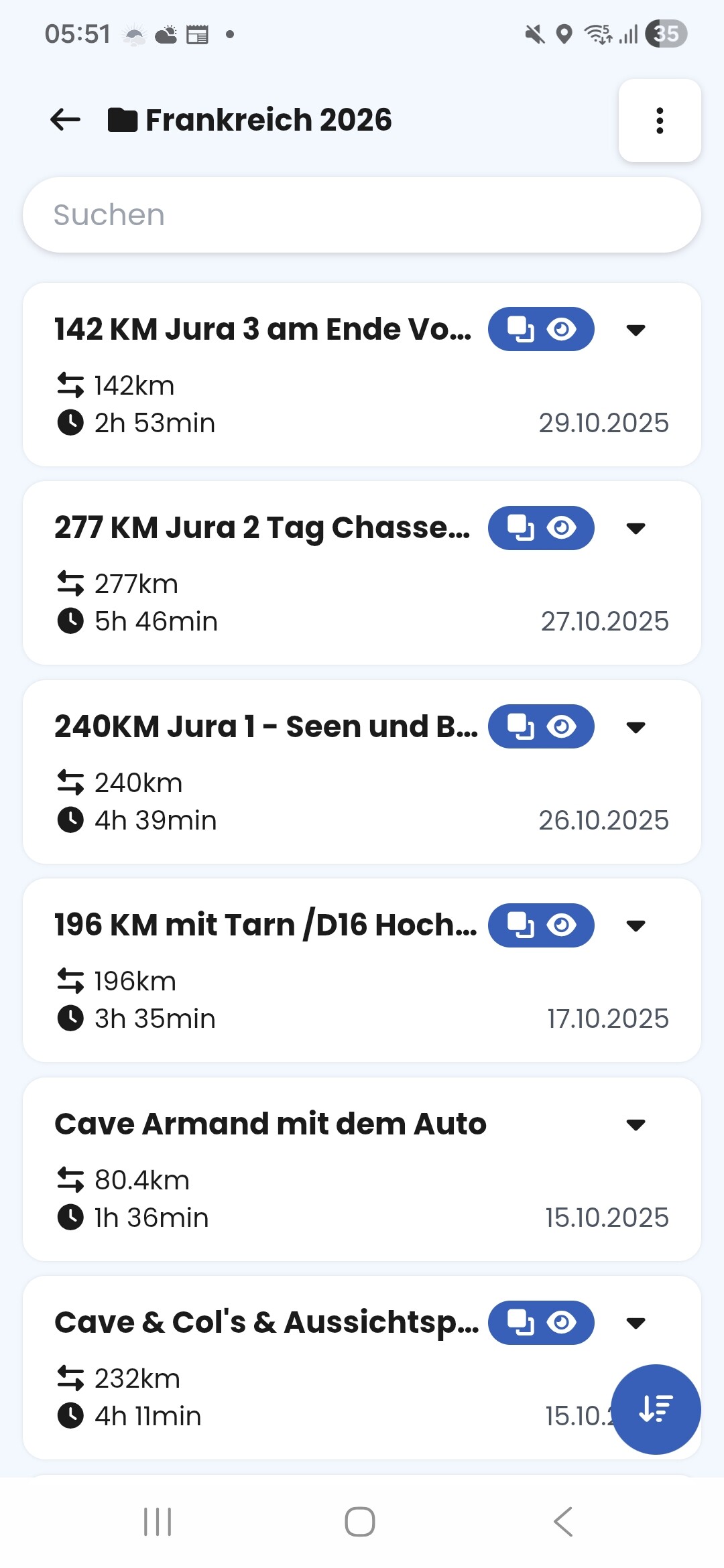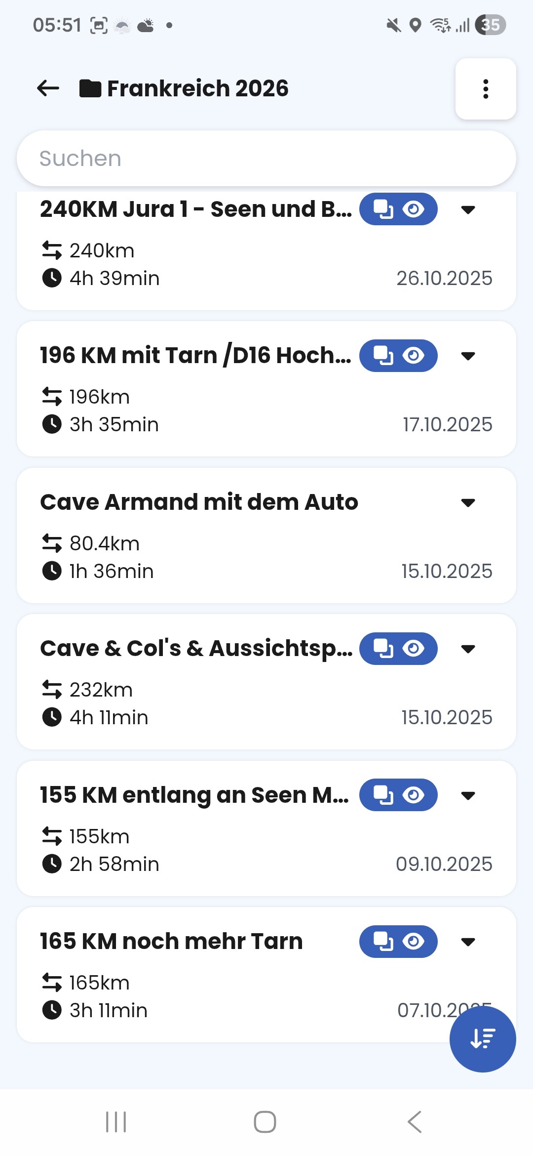 In diesem Fall werden alle im Ordner enthaltenen Routen als Overlay angezeigt, aber eben nur in der Farbe, die dem Ordner-Overlay gegeben hast, im Beispiel blau. Wie @Urwi schrieb, kommt man mit 15 maximal möglichen Overlays nicht weit. Deshalb der Vorschlag, Unterordner bilden zu können, damit man jeder Route aus diesem Overlay-Ordner eine eigene Farben geben könnte.