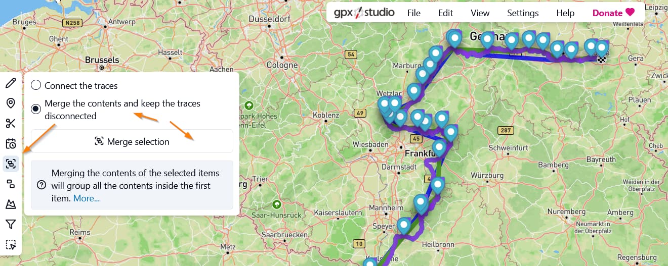 Wenn ich zusammenführe, dann verbindet GPX.studio die Tracks mit Linien. Wenn ich die Tracks einzeln haben möchte, dann werden einzelne Dateien exportiert.