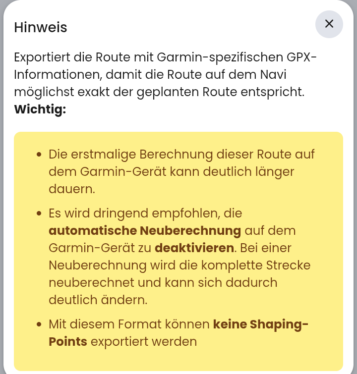 Bei der Planung habe ich bewusst SP eingefügt. Hätte ich die SP nicht, wäre es nicht mehr dieselbe Route; oder spätestens bei Neuberechnung. Wenn gesagt wird “Nein, bitte keine SP - ich weiß, was ich tue”, dann ist das m.E. ein Feature Request (so wie “bitte nur Wegpunkte exportieren wahlweise SP, WP”) zusammen mit der Beschreibung des Usecases.