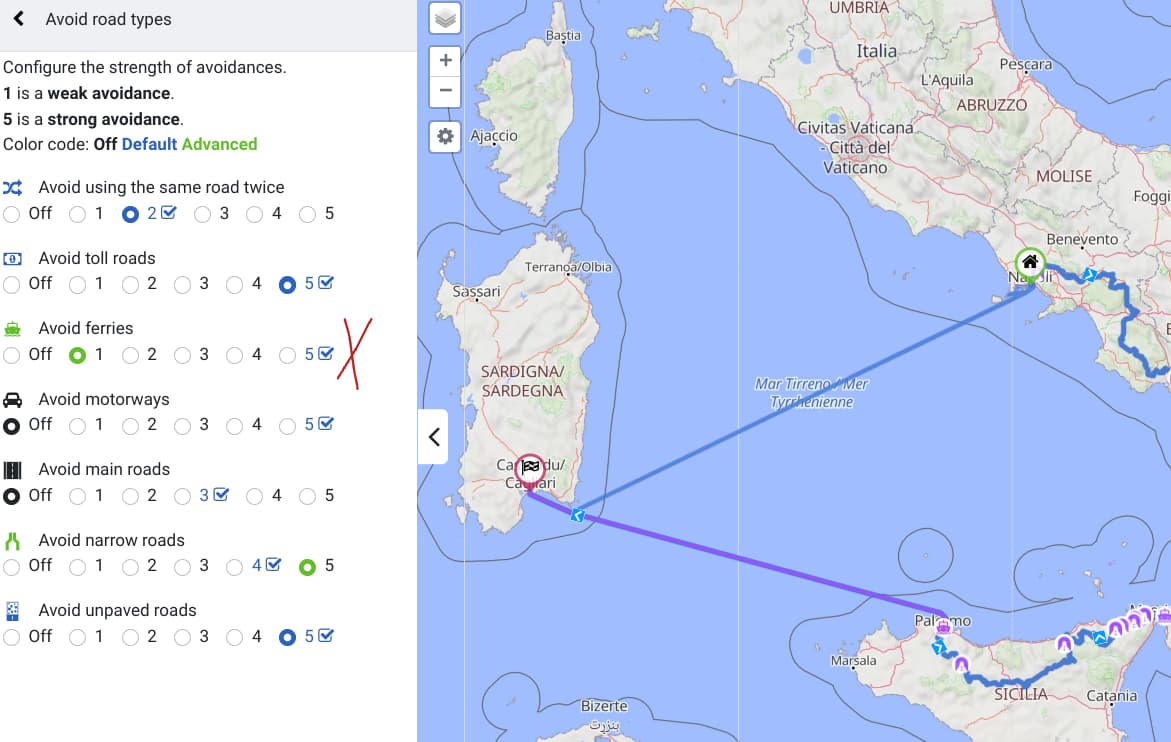 I am planning a route from Naples (Italy) to Cagliari (Sardinia). There is a direct ferry connection between Naples and Cagliari, but the software routes from Piombino (Italy) to Olbia (Sardinia). Am I doing the steps wrong or is something else causing the problem?