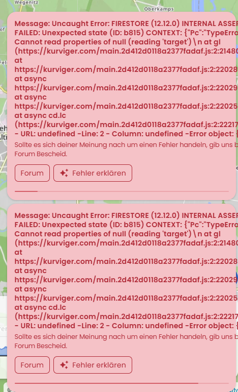 Message: Uncaught Error: FIRESTORE (12.12.0) INTERNAL ASSERTION FAILED: Unexpected state (ID: b815) CONTEXT: {“Pc”:“TypeError: Cannot read properties of null (reading ‘target’)\n at gl (https://kurviger.com/main.2d412d0118a2377fadaf.js:2:2148033)\n at https://kurviger.com/main.2d412d0118a2377fadaf.js:2:2202899\n at async https://kurviger.com/main.2d412d0118a2377fadaf.js:2:2202947\n at async https://kurviger.com/main.2d412d0118a2377fadaf.js:2:2202514\n at async cd.lc (https://kurviger.com/main.2d412d0118a2377fadaf.js:2:2221734)”} - URL: undefined -Line: 2 - Column: undefined -Error object: {}