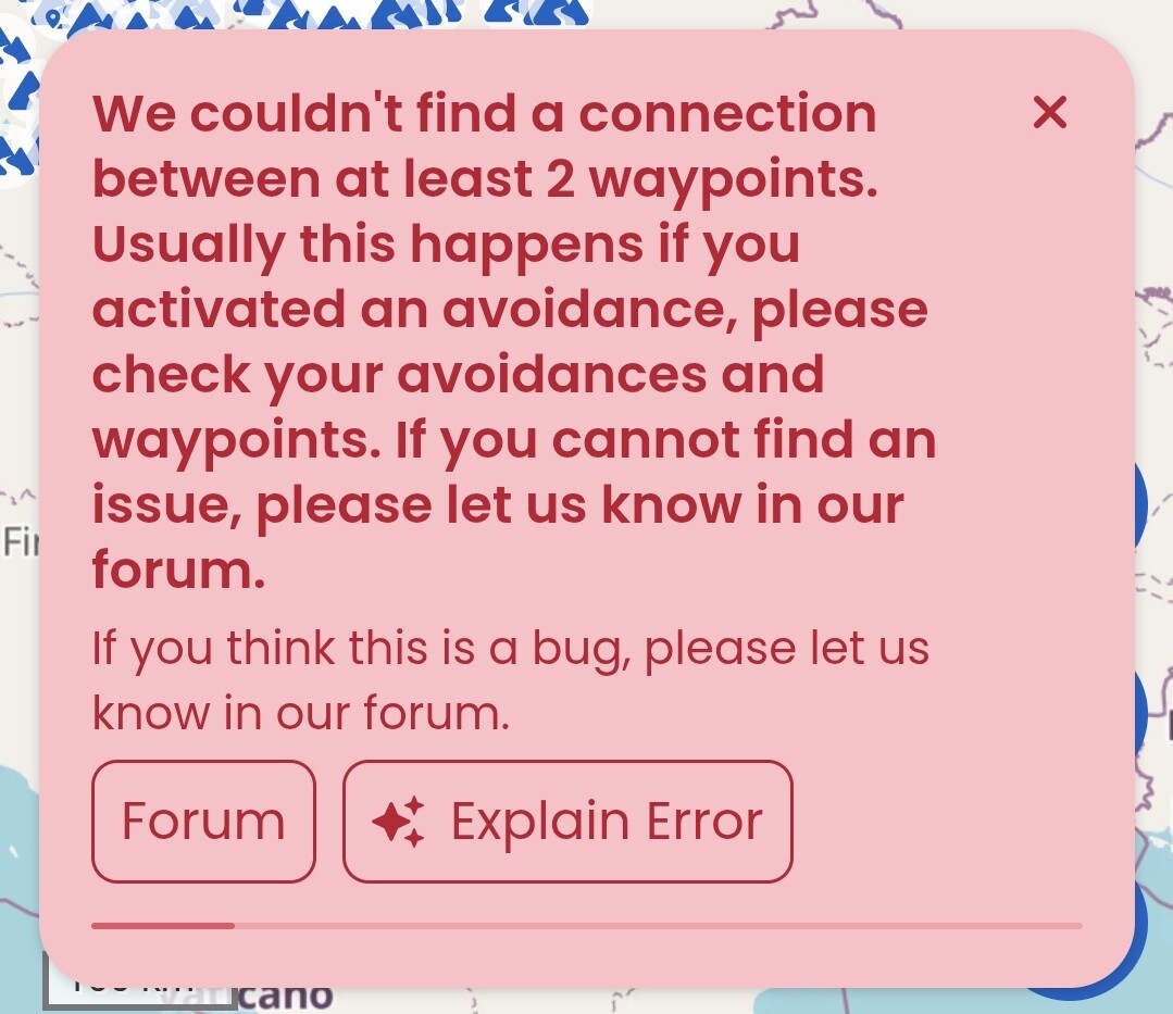 Wir können zwischen mindestens 2 Deiner Wegpunkte keine Verbindung finden. Meist liegt das an einer aktivierten Vermeidung, bitte prüfe Deine Wegpunkte und Vermeidungen. Falls Du keinen Fehler finden kannst, gib uns doch bitte im Forum bescheid.
