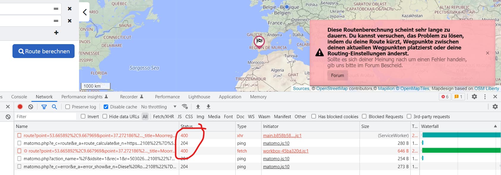 Diese Routenberechnung scheint sehr lange zu dauern. Du kannst versuchen, das Problem zu lösen, indem du deine Route kürzt, Wegpunkte zwischen deinen aktuellen Wegpunkten platzierst oder deine Routing-Einstellungen änderst.